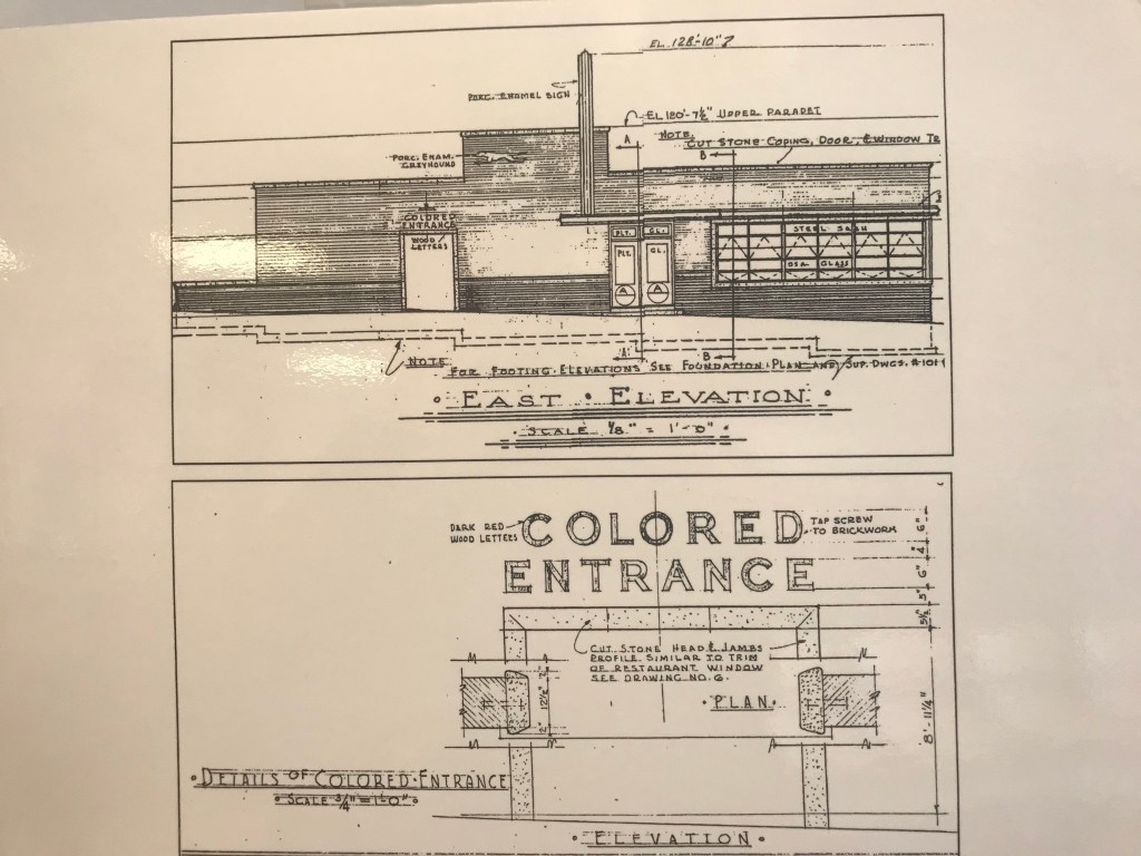 These architectural drawings lay out the segregation and unequal nature of the bus station. The separate colored entrance was an opening in the wall from the bus bay. The waiting room was smaller than and had a separate lunch counter from the white section. This was the “social fabric” of the south, Alabama, and Montgomery.