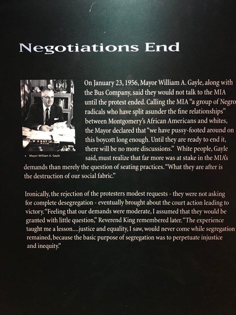 An overflow crowd of 5000 went to the Holt Street Baptist church where the community agreed to engage in a prolonged bus boycott. They were led by a 26 year old minister – Dr. Martin Luther King, who had been in Montgomery for only a year at the nearby Dexter Avenue Baptist church. A new organization was created – the Montgomery Improvement Association (MIA) that would negotiate with the city while NAACP legal challenges wound their way through the court. The determination and expectations in the black community were sky high. The boycott was successful even though it took over a year to resolve, because the MIA created a highly organized ride-share, people were willing to walk, and there was solidarity.