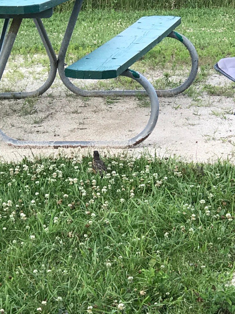 I have more robins here at Big Rock including another family! This one has one junior bird who hops around following his/her mama. He tried flying into a window on the Airstream the other day and finally fell to the ground, looking a bit stunned – like, why didn’t that work? He eventually hopped away to where his mama was sitting a safe 20 yards away from me.