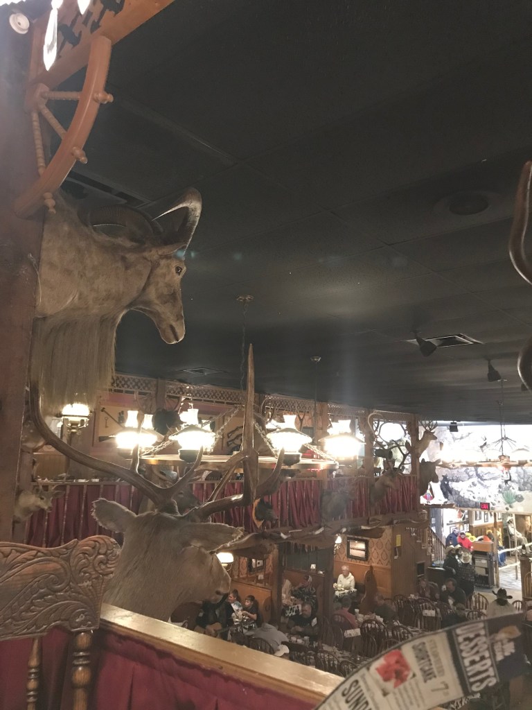 The Big Texan is home to the 72oz. steak dinner challenge – consume the big steak, roll, 3 shrimp, potato, and salad in 60 minutes or less and the meal is free! I didn’t get to see a contestant that evening, but the thought of it was fun, even for this vegan. While I waited for my table, I perused the gift shop filled with everything Texan. The live, caged rattlesnake, however, was the most interesting item by far. Not for sale, but definitely an unexpected item. I sat in the balcony area that ringed the dining room. There were stuffed animal heads on the walls, strolling cowboys with guitars to serenade you, and lots of down-home bar-b-que in addition to any steak, size, and cut you could want. I had a fun evening!