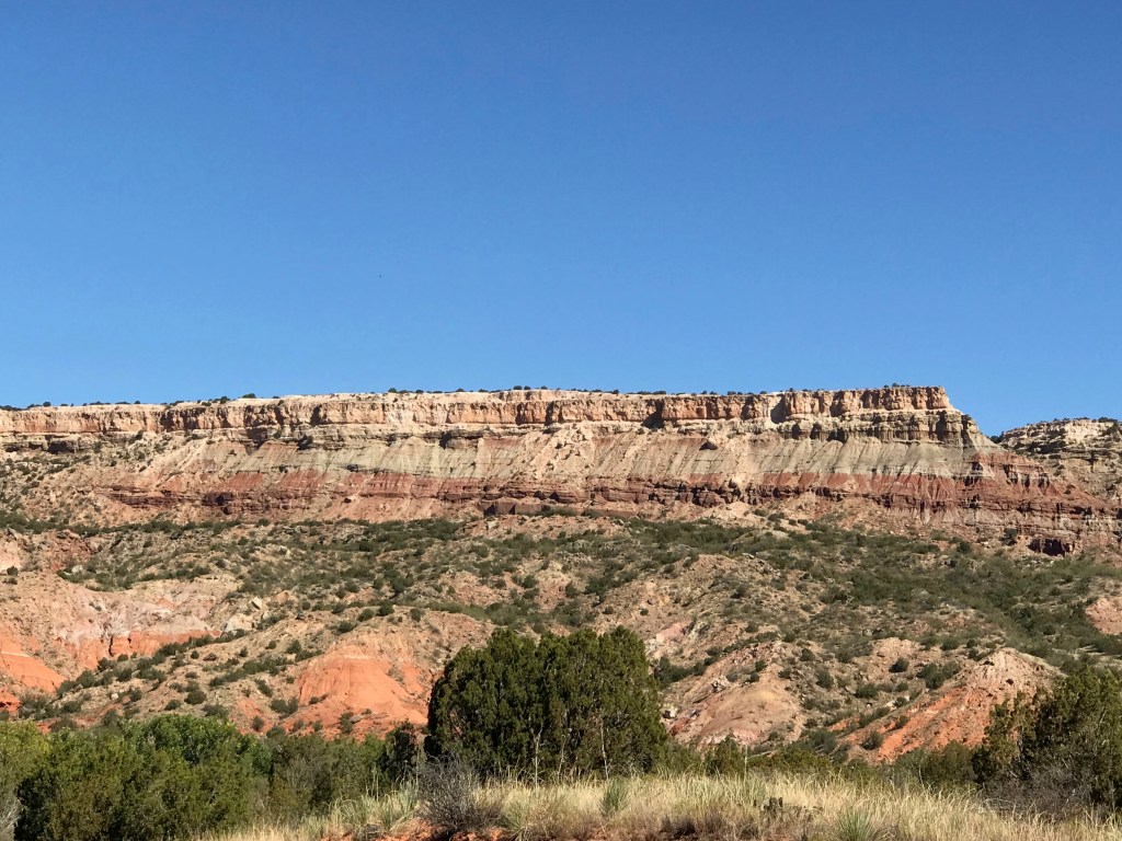Palo Duro Canyon is second only to the Grand Canyon in size. Once inside the park, you start a descent down a two-lane road towards the canyon floor. I was there fairly early in the morning so traffic coming up was extremely light. Good thing, because I gripped the wheel tight when the sign said “10% grade, use low gear.” It was challenging and I made it. Once at the bottom, the scenery was breathtaking (I can’t look out while I’m driving on the side of a canyon or mountain – too scary!). There is a lot of red in the canyon wall along with a white stripe and different shades of brown, topped by hard rock. I found my campsite and was delighted to find that this was an electric and water camp loop. I didn’t think I would have either. I got out a camp chair after I unhitched with my now working jack and marveled at the scenery all around me.
