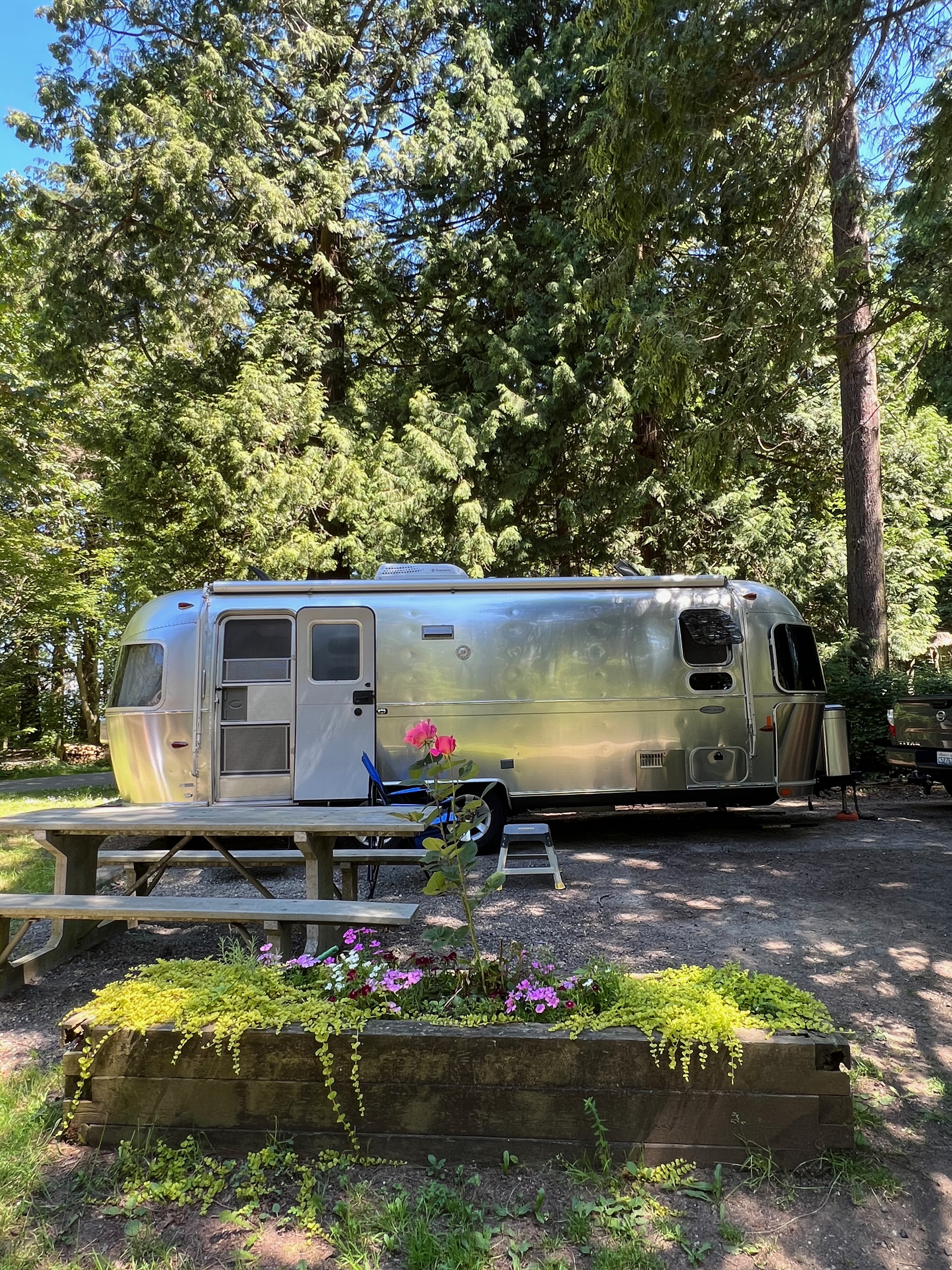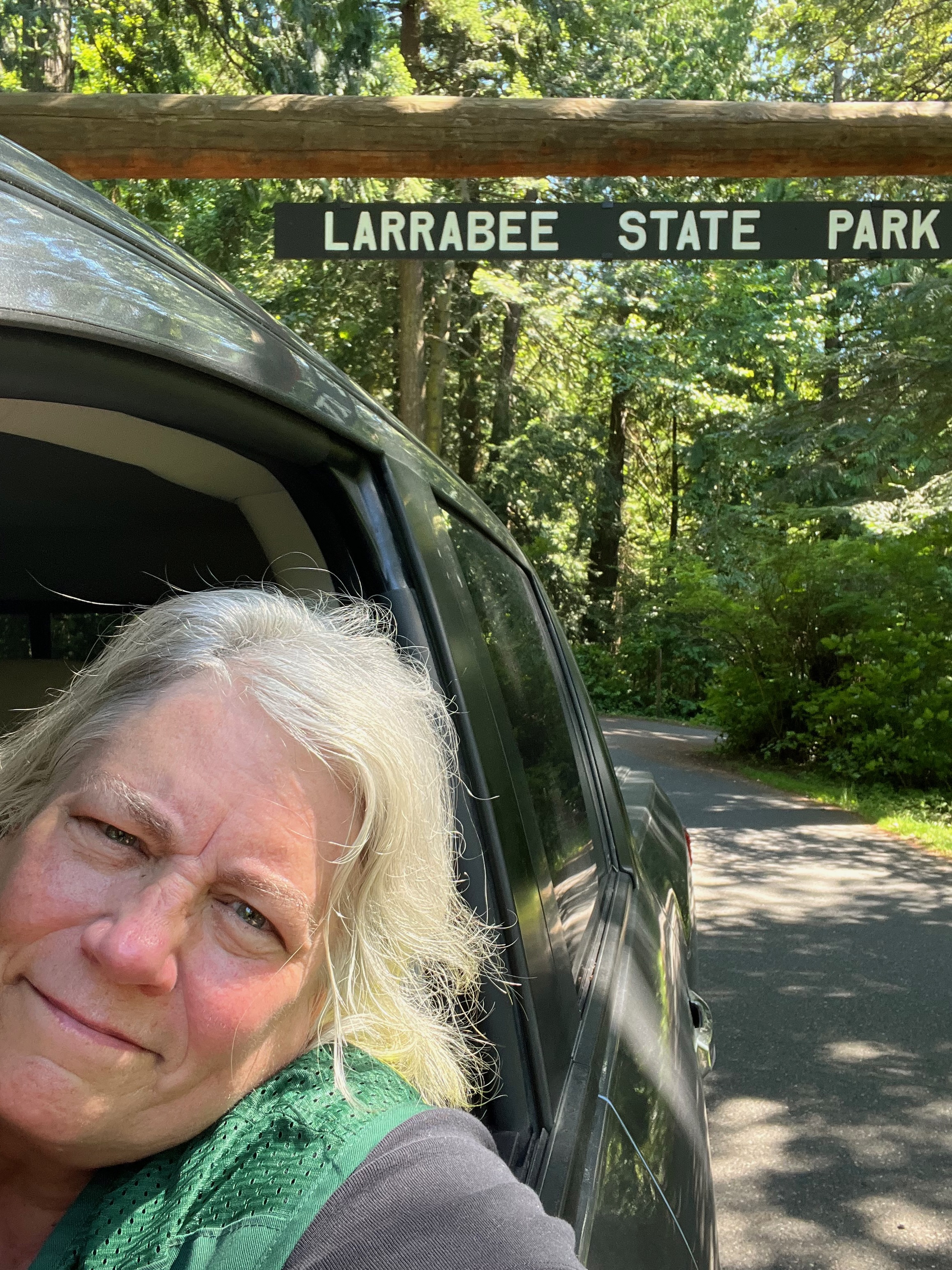 Larrabee State Park sits on the side of Chuckanut Mountain which runs down to the sea. It is rugged terrain and the dense forest has a lot of old-growth trees. Trails climb into the mountain where you’ll reach freshwater lakes or take a steep walk down through a ravine to get to the beach in a cove. The scenery is breathtaking. I was the alternate host and did not have a space in the campground, but had a full hookup site in the maintenance yard which sits next to a trailhead up into the mountain. The terrain at Larrabee is so challenging I bought hiking poles. The campground has a pitch to it, uphill and then downhill and the tent campsites have some rugged elements – like enormous tree roots, which I caught my foot on one day and took a face plant into the ground. All in a day’s work.