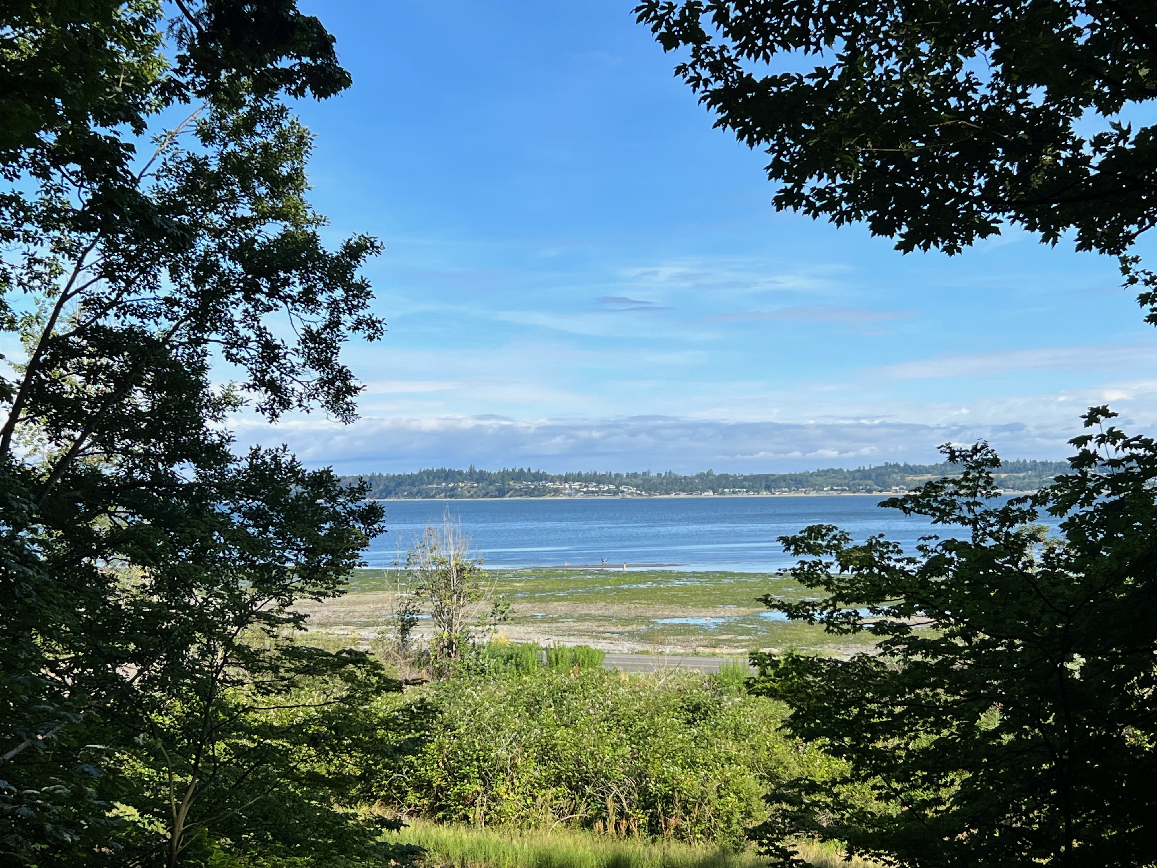 There was an emergency need for a host at Birch Bay and they asked me to take it. I have a lovely spot for the month of July inside the camping loop with 74 campsites to maintain. Across the park road, there are another 93 sites with a second host. The bayfront is beautiful and the beach is huge and easily accessible. Old growth trees fill the park and the setting is tranquil and blessedly flat!