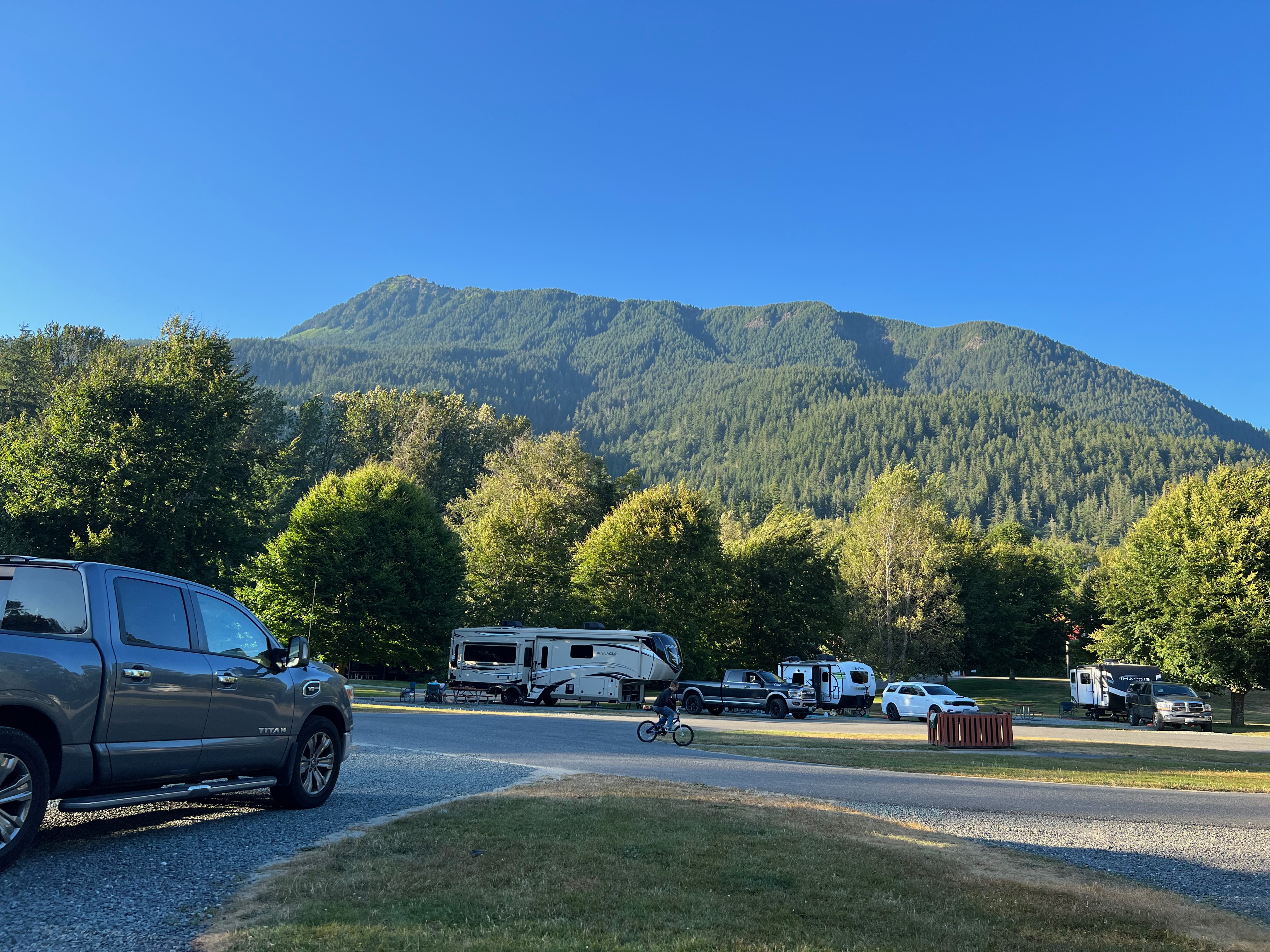 I finished my Birch Bay camp host gig at the end of July. On August 1 I headed for Howard Miller Steelhead RV park – a county park, on the Skagit River in Rockport, WA. I had a clear view of the beautiful turquoise water. I could hear it rushing by all the time. A good-sized ridge stood behind me and trees ran from top to bottom. The scale of the PNW always surprises me – the volume, height, and land mass of the natural features.