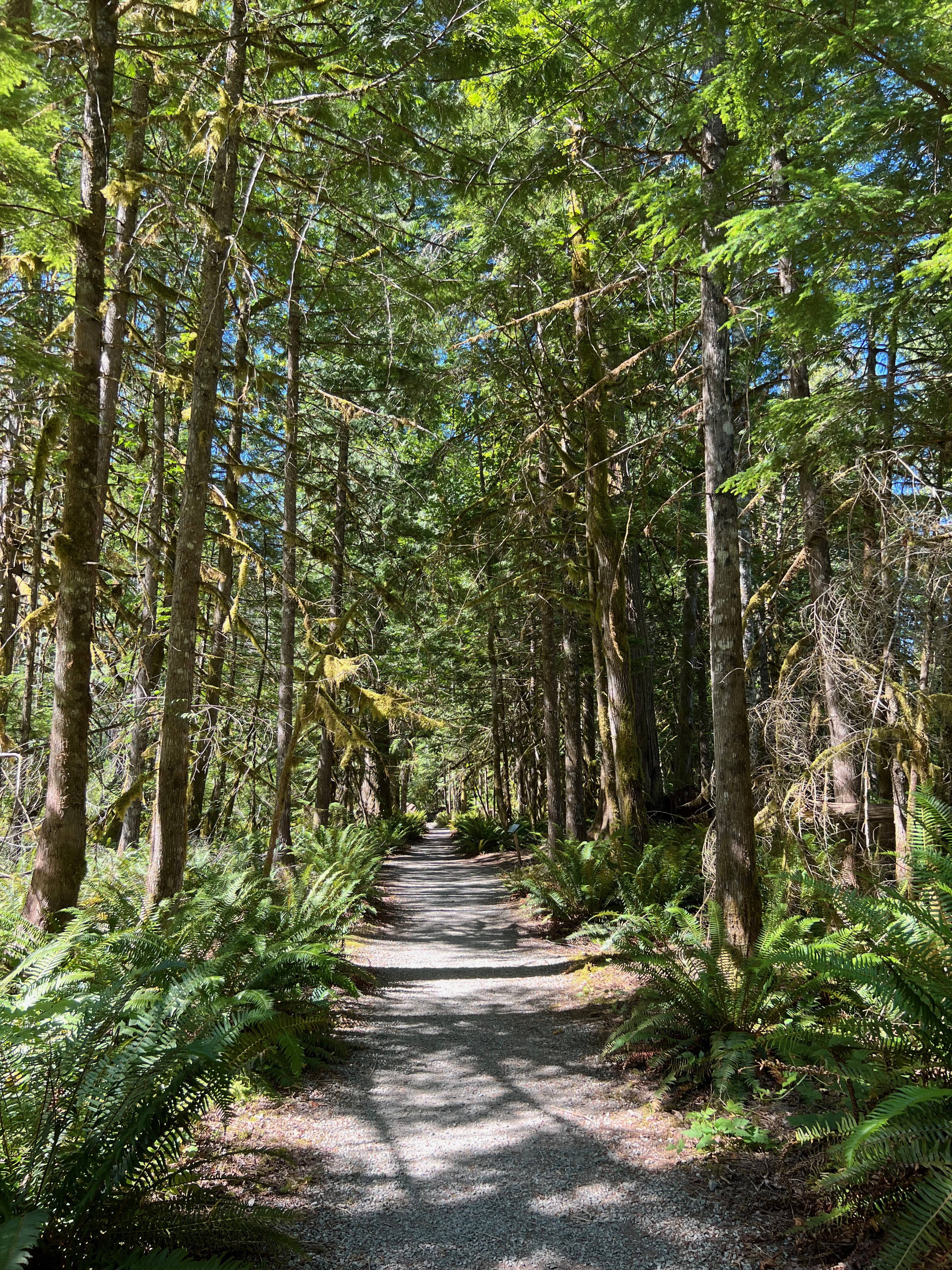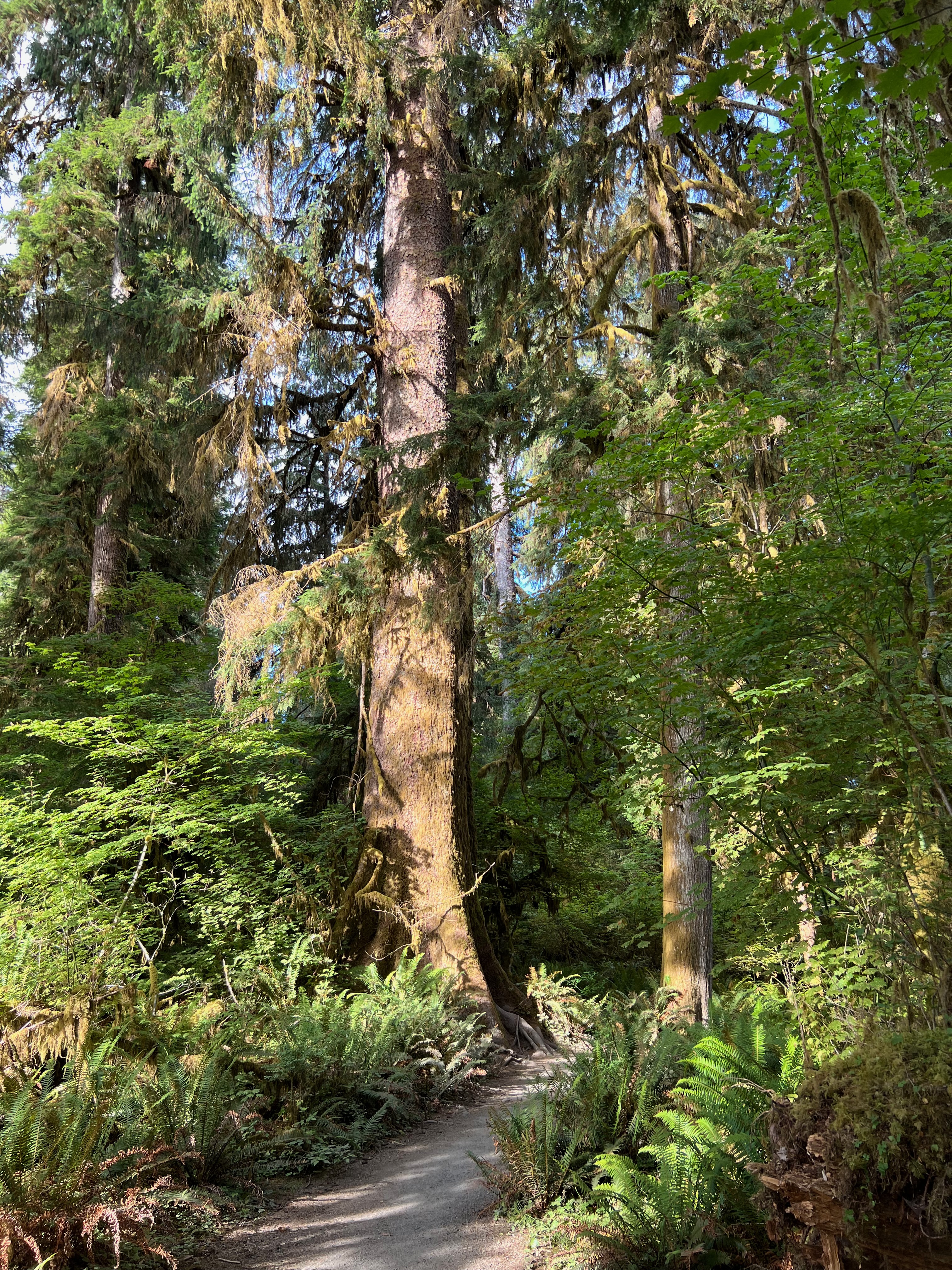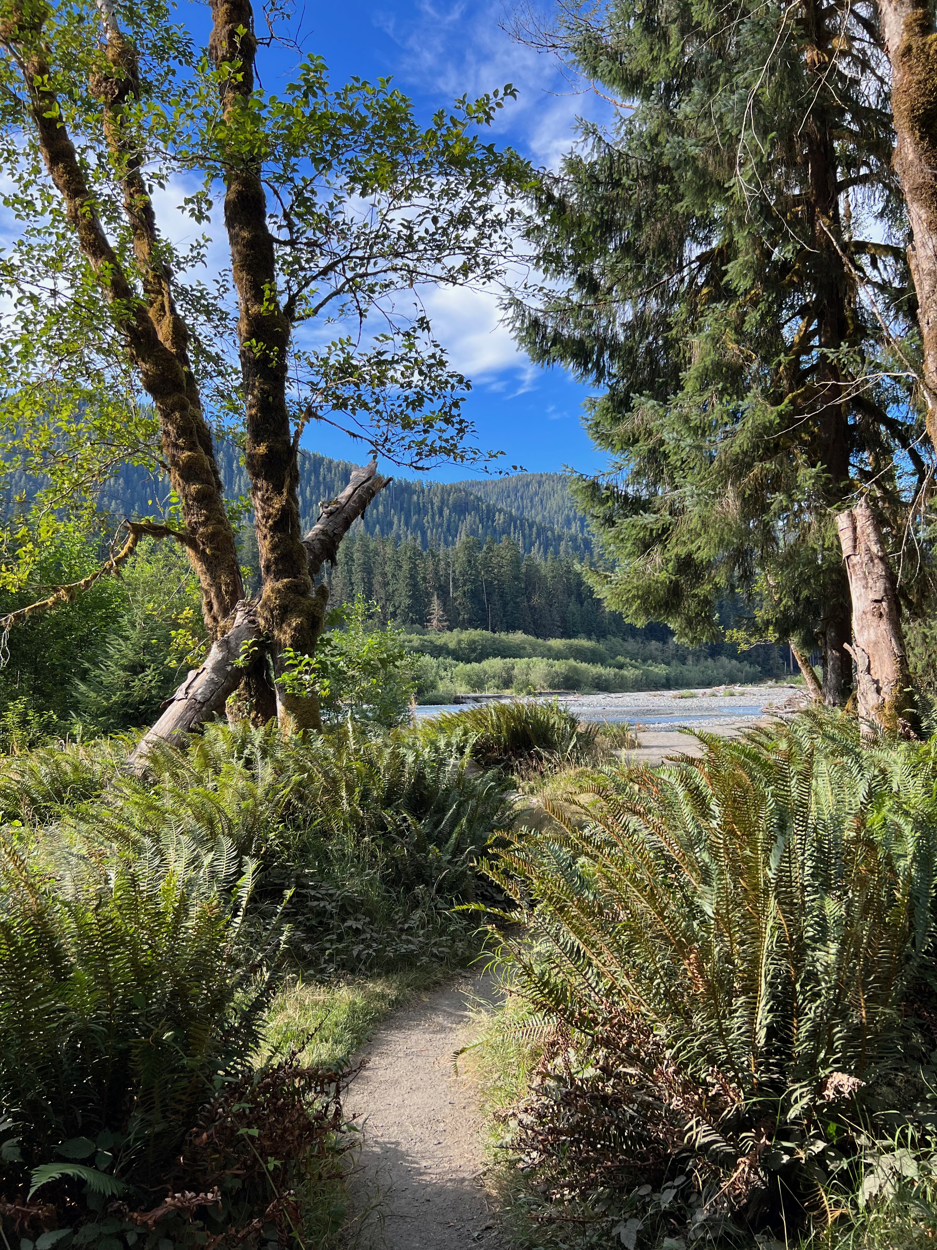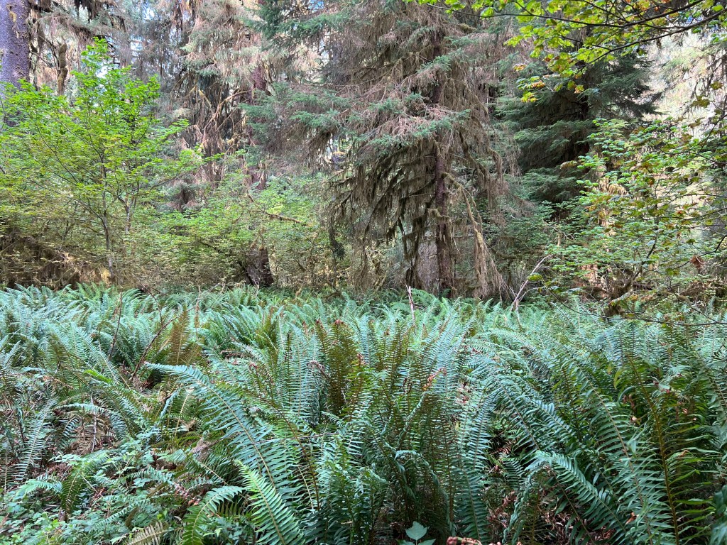 It’s very wide and rocky. This time of year the water does not fill the space as it does in the spring. This river is fed by glaciers on Mt. Olympus and the snowmelt travels 7000 feet down to create this river that empties into the ocean. The landscape changes into a rainforest. Exceedingly tall trees drip moss and are covered in lichen. Ferns cover the forest floor and the peaty smell is quite noticeable.