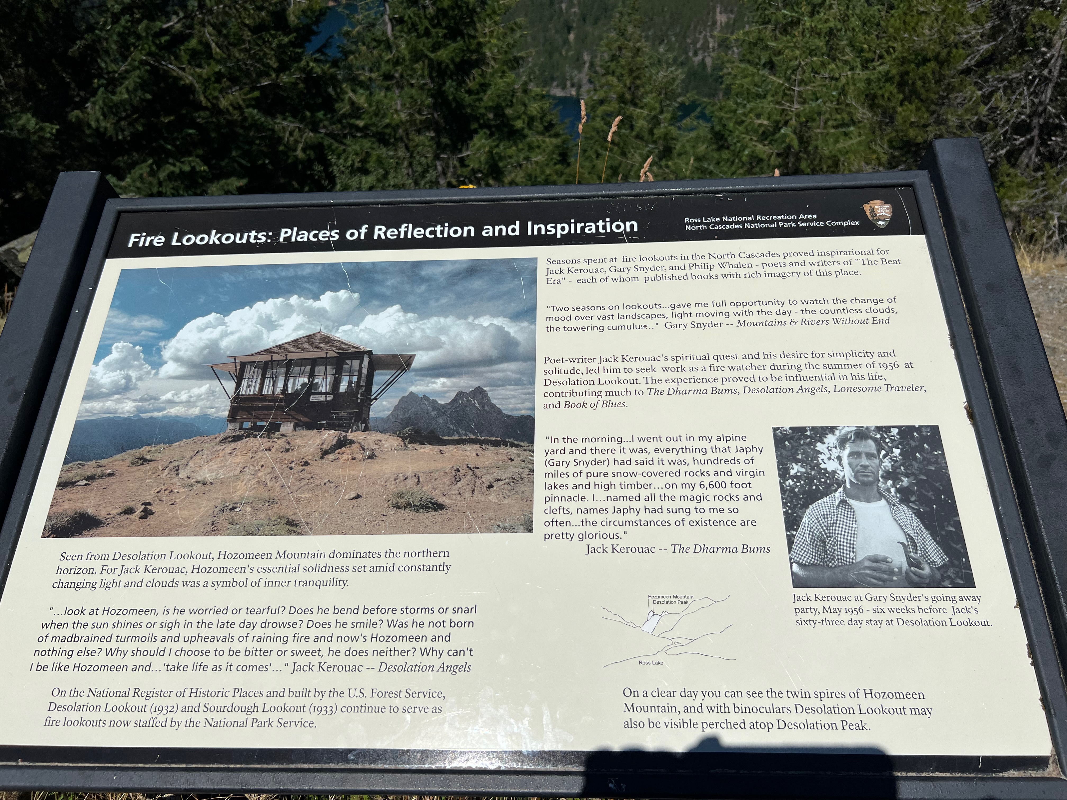 There are interpretive boards at most of the lookout points telling the history of the place or other tidbits. The last stop overwhelmed me. Most people know I am a fiction writer in addition to my travel articles and this blog. My inspiration for my writing journey and jumping into an Airstream is Jack Kerouac who wrote, On The Road, the quintessential work of the beat generation. See the picture for the last interpretive plaque. He spent a summer living in a fire tower in the park and it was the inspiration for another one of his books, Desolation Angels. He was moved by being in the vast stillness, gazing on Mt. Hozomeen every day. The lookout positions you to see Desolation Point and Mt. Hozomeen beyond it. I experienced what he did and it was moving.