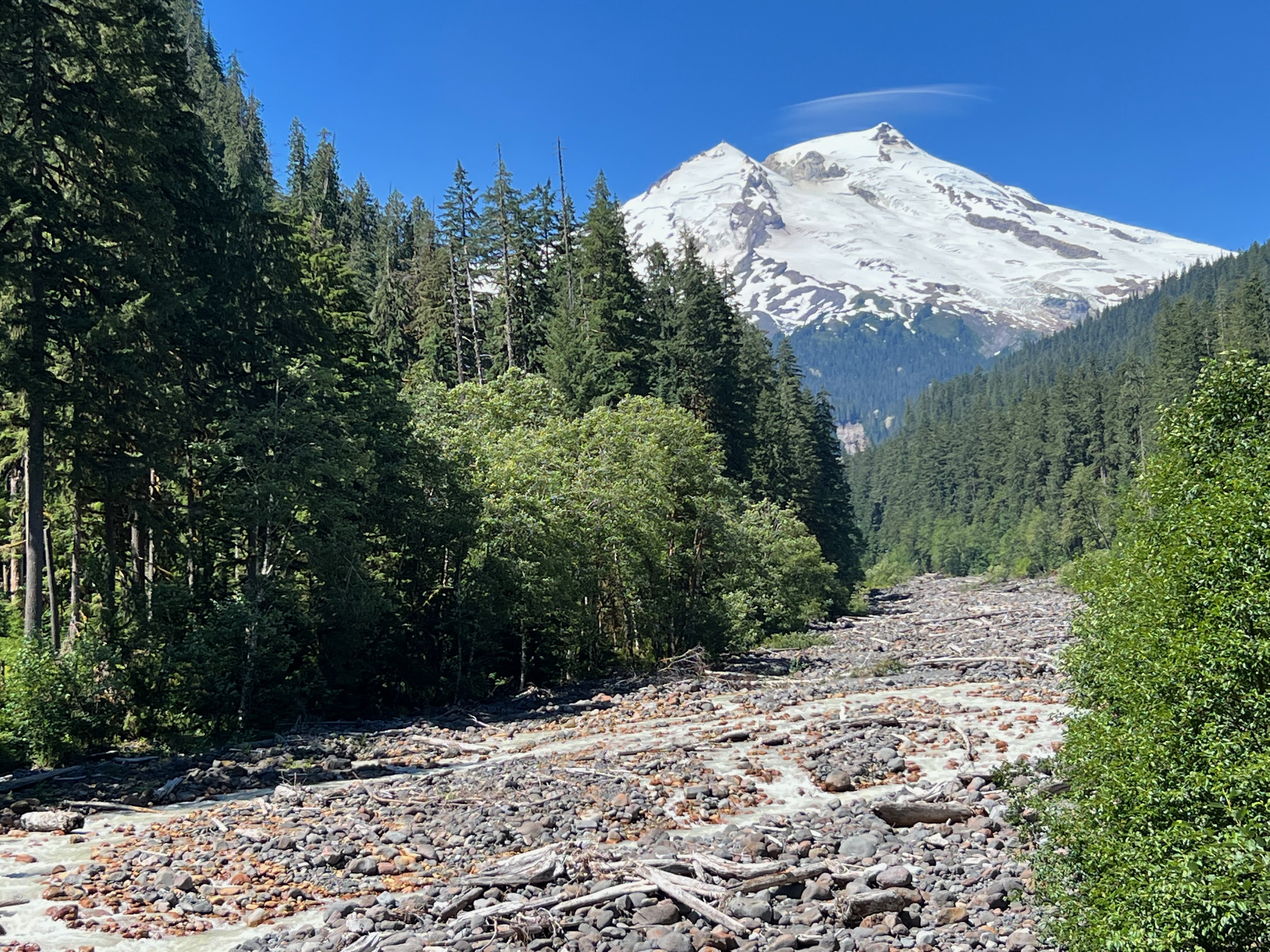As I continued driving, quite by accident, I came back across a wide creek that sometimes is a raging torrent, and there it was – a magnificent view of Mt. Baker. Luckily, there was a turnout area to park and a pedestrian side of the bridge. The mountain was so close I thought I could walk right up to it. The glaciers were visible and a cool breeze came down through the forest opening along the creek. Amazing views of the glaciers and a stillness that quiets my soul. It’s as if I’m running and finally arrived.