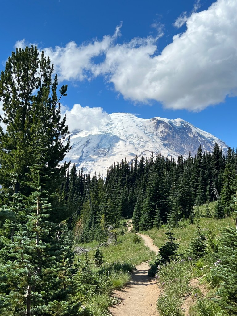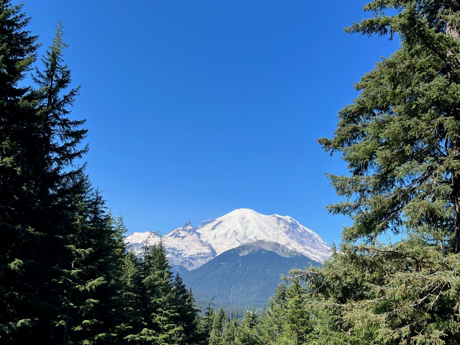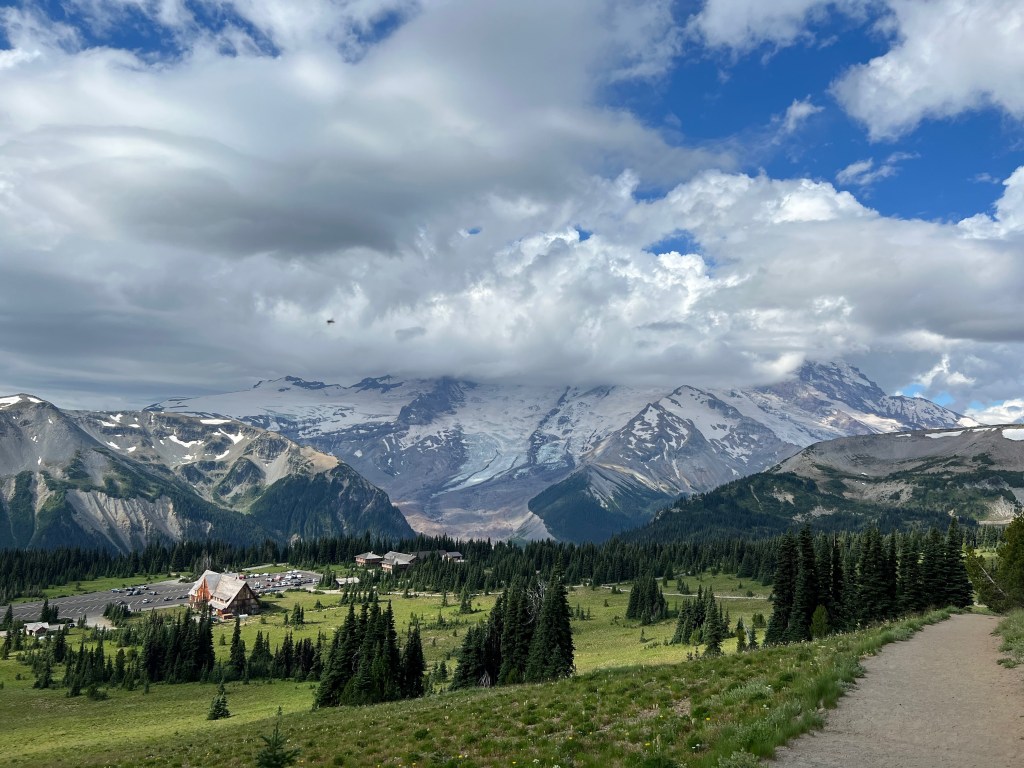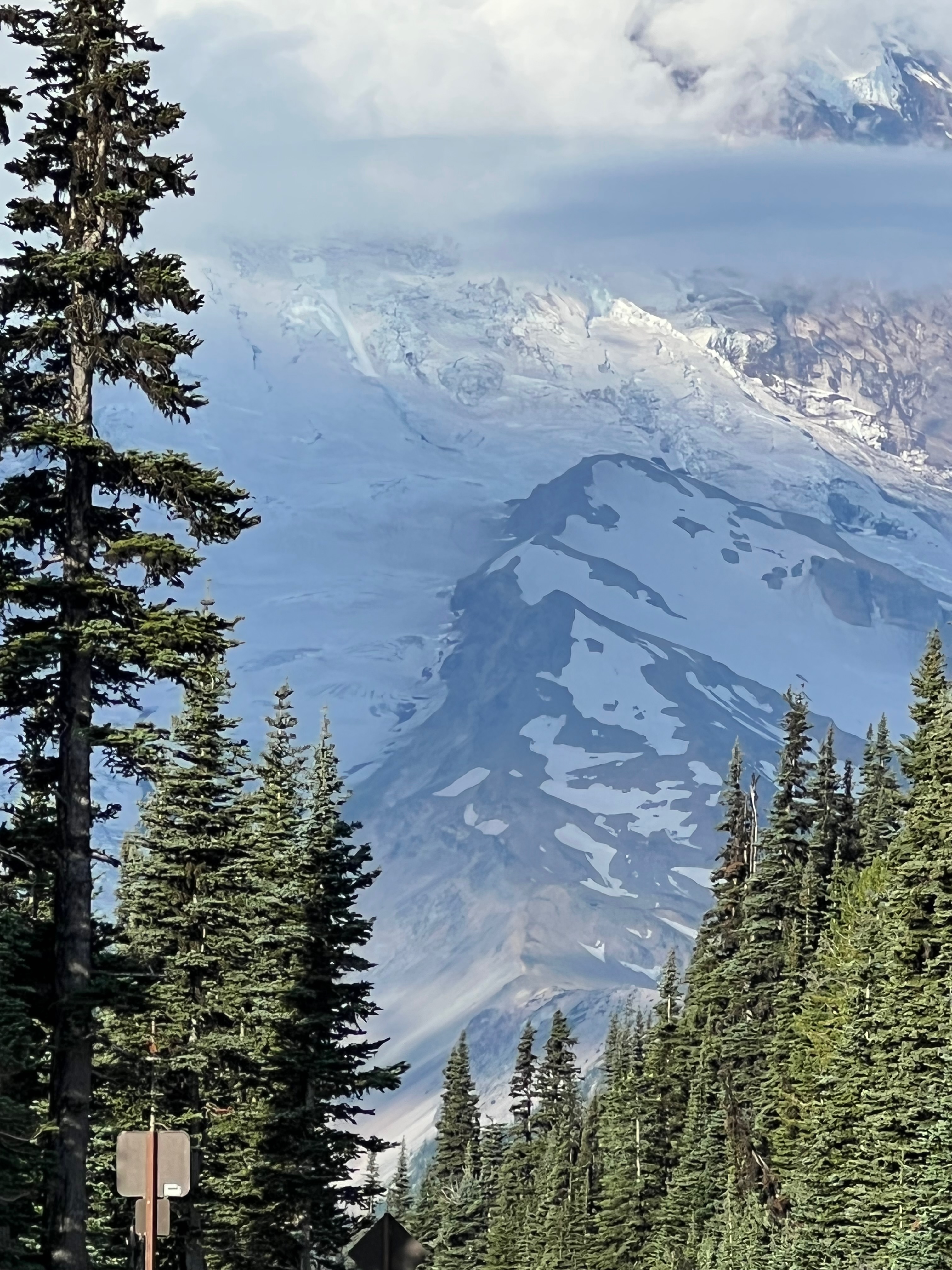 It was a majestic view as I pulled in. Rainier is 14,000 feet at the summit, so I was halfway there. The early morning clouds shrouded the peak but there was plenty to see. I was certain I could reach out and touch it – it seemed so close.