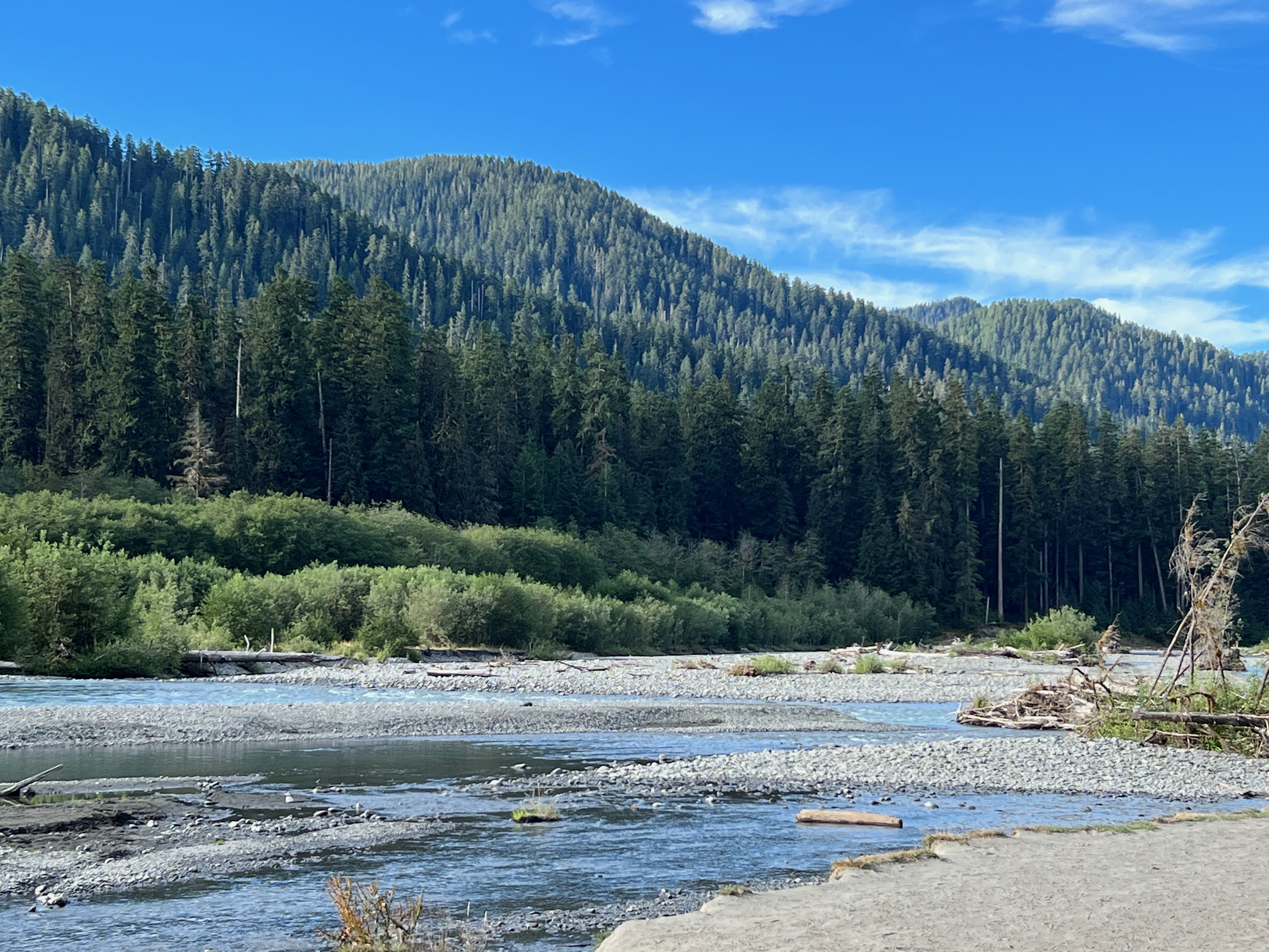 I passed Kalaloch, part of the park but also part of the Native American presence on the peninsula (many tribes have land here). Finally, I got to the Hoh turnoff. Another 18 miles to the campground with more winding, two-lane road adventures, more repaving, and then I see the Hoh River.