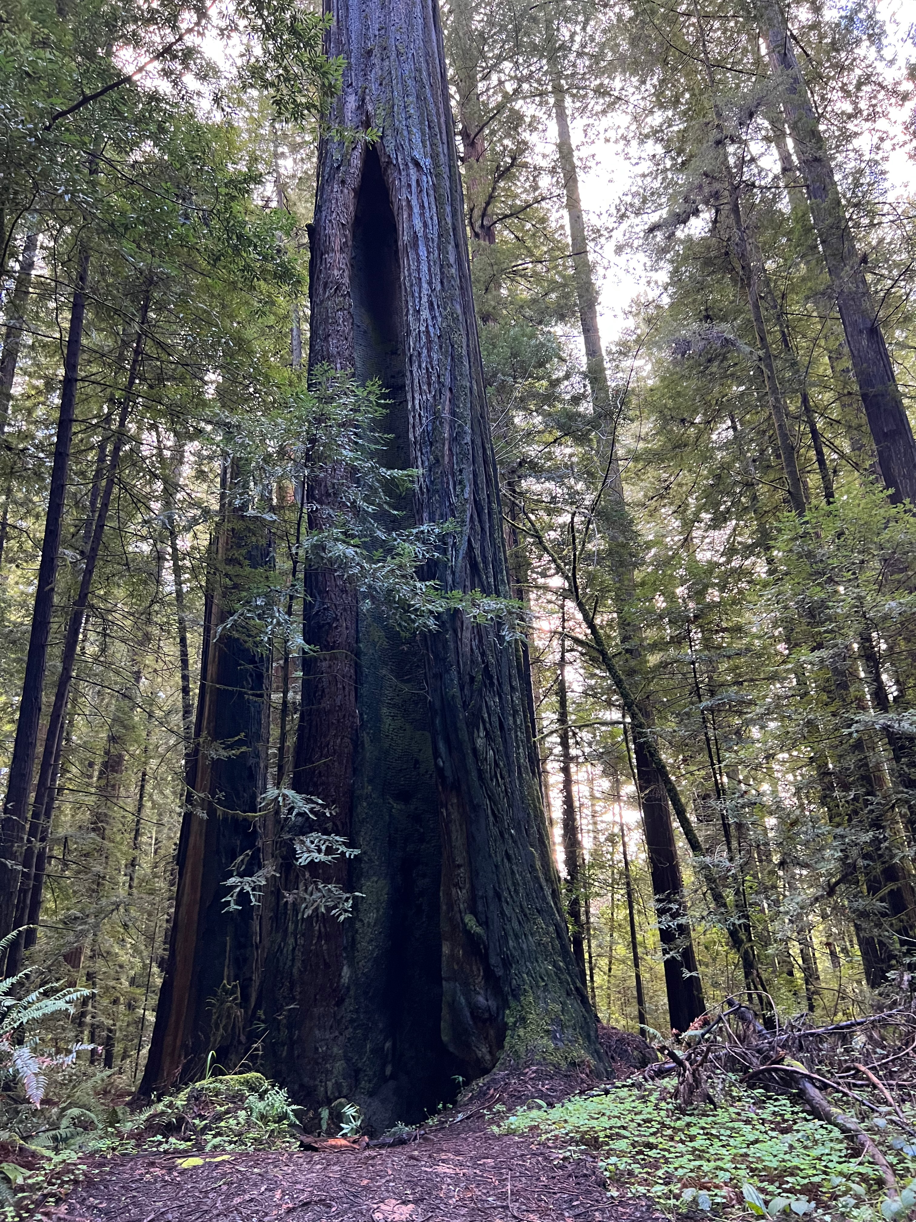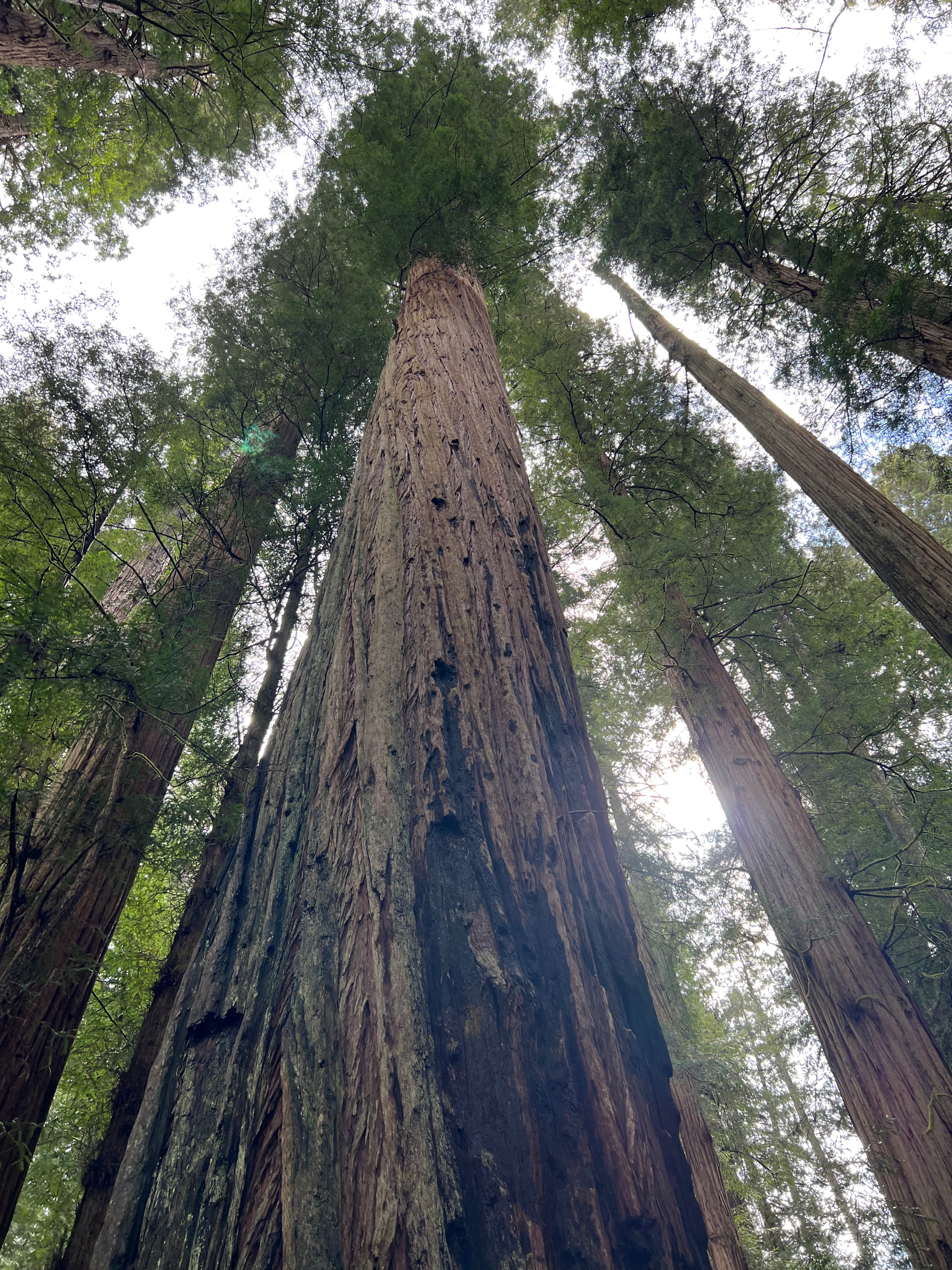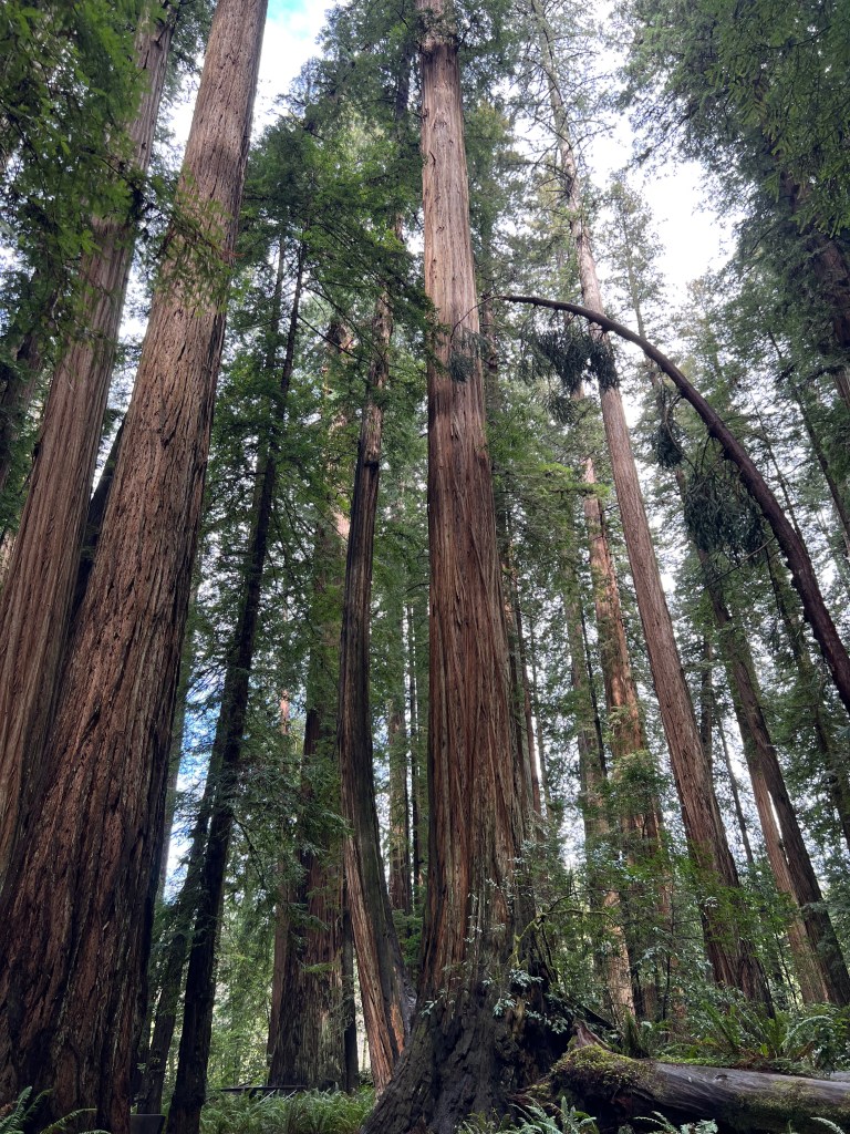 Redwoods have very shallow root systems and more boughs than most trees. It’s quite common for them to fall over if the ground is too saturated. Limbs fall constantly and when the tree is over 200 feet tall, the crash of that limb on the ground creates a mess. The forests here are dense and that is due to the preservation efforts of the Coast Redwood League. The ancient trees were on their way to being clear-cut. The trees are inordinately straight and tall – a logger’s dream. But their beauty and limited growing area meant they needed protection. Coast Redwoods grow on the coast only – because they need a damp, foggy climate to propagate. It’s also what enables them to grow to be so tall. They only appear from Big Sur to Northern California. When I crossed out of California into Oregon, it was as if a switch was flipped and the Redwoods disappeared.