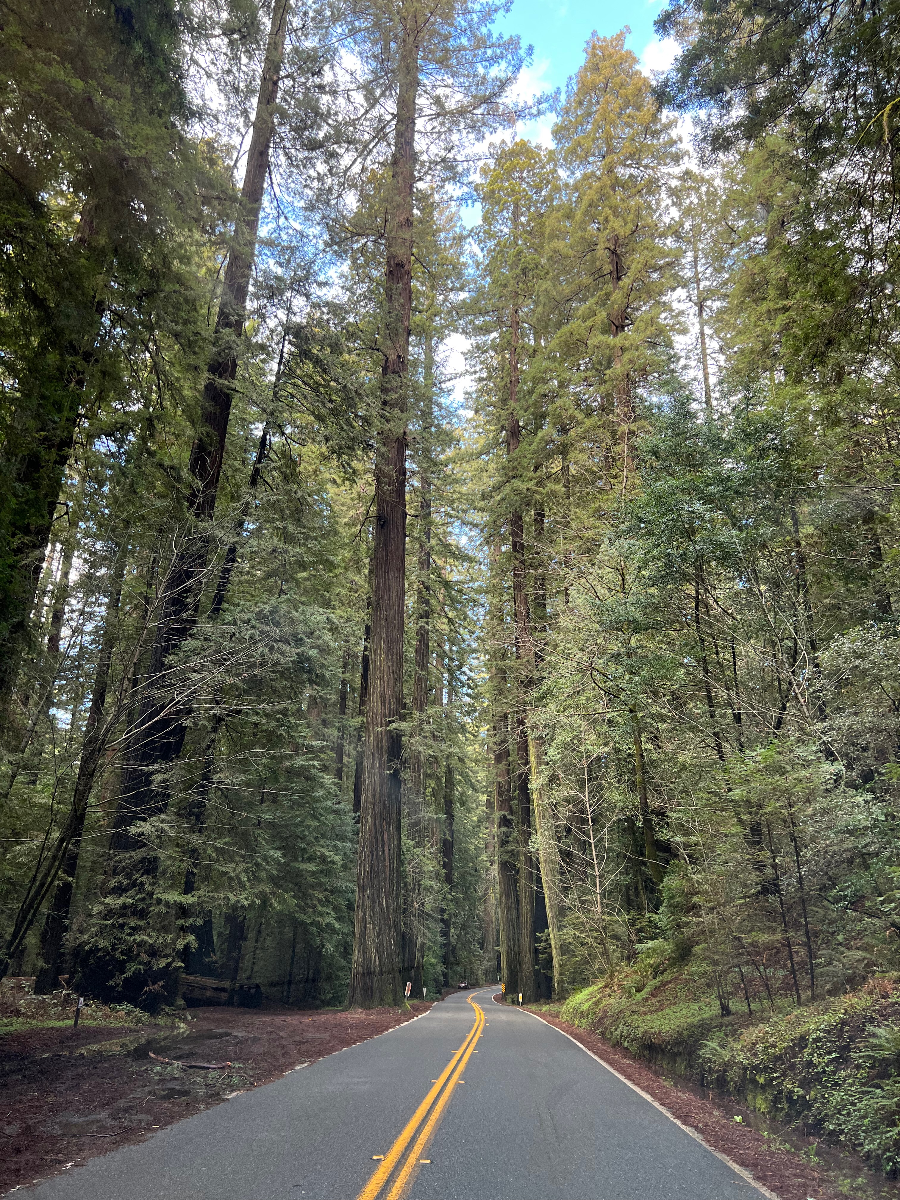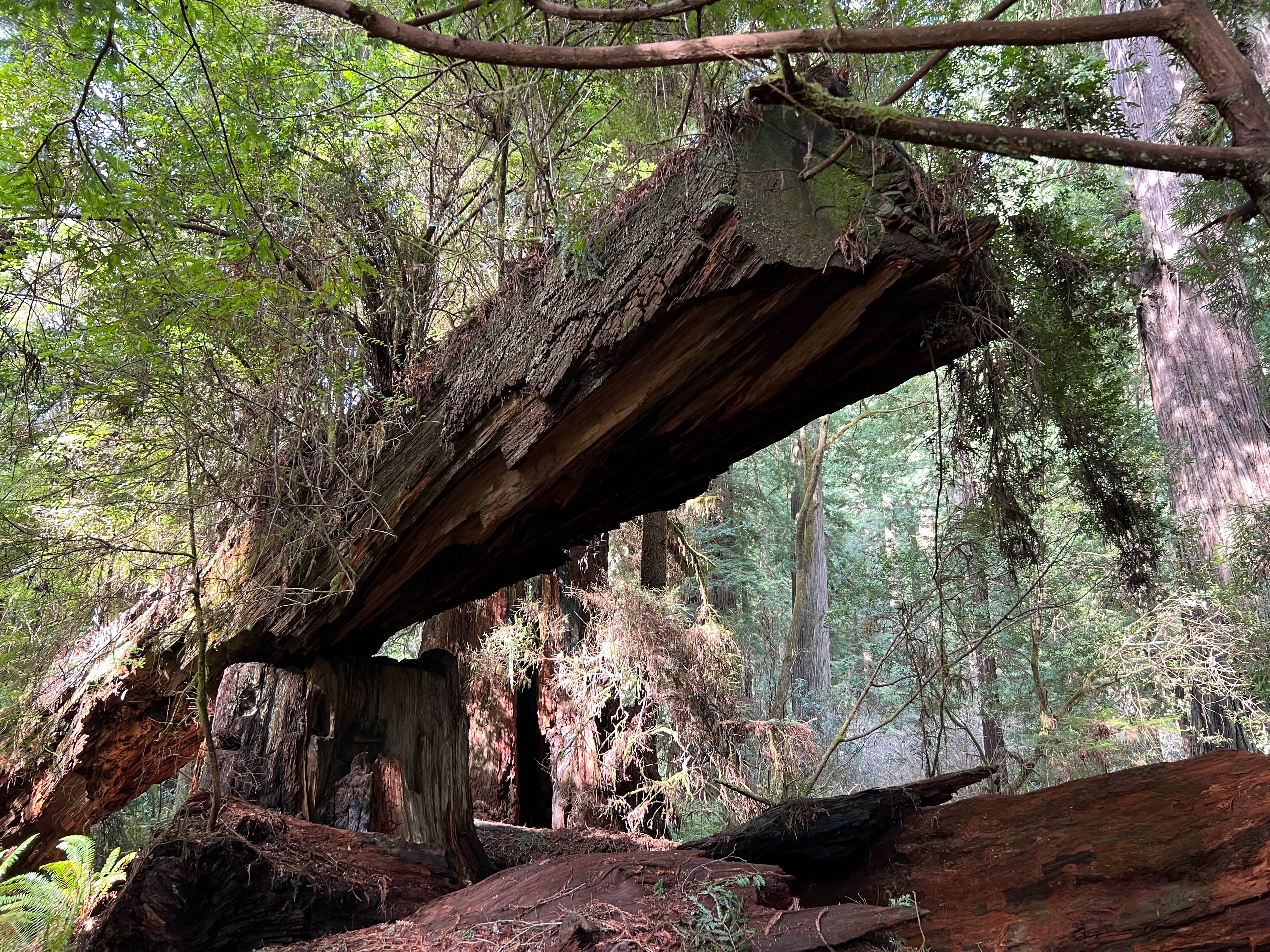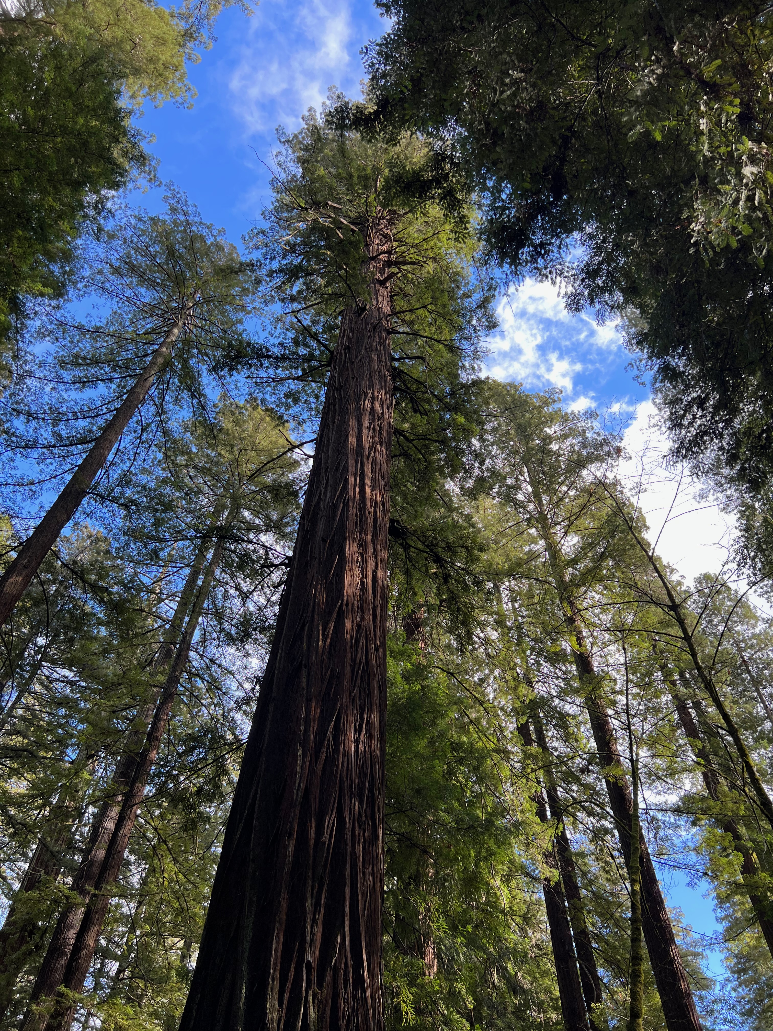 Redwoods have very shallow root systems and more boughs than most trees. It’s quite common for them to fall over if the ground is too saturated. Limbs fall constantly and when the tree is over 200 feet tall, the crash of that limb on the ground creates a mess. The forests here are dense and that is due to the preservation efforts of the Coast Redwood League. The ancient trees were on their way to being clear-cut. The trees are inordinately straight and tall – a logger’s dream. But their beauty and limited growing area meant they needed protection. Coast Redwoods grow on the coast only – because they need a damp, foggy climate to propagate. It’s also what enables them to grow to be so tall. They only appear from Big Sur to Northern California. When I crossed out of California into Oregon, it was as if a switch was flipped and the Redwoods disappeared.