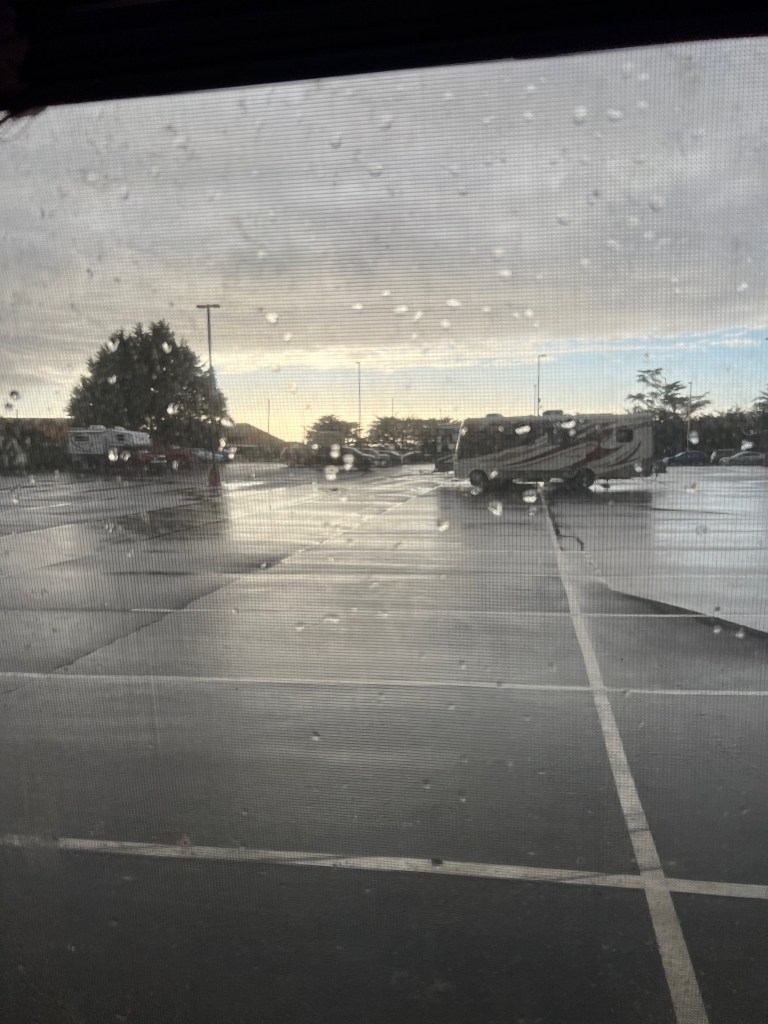 I had to stay longer in Ukiah than I expected because winter storms kept rolling through. I waited for the snow to stop and melt on the road north of me. Proceeding too quickly would have put me in a difficult situation with the trailer in tow. This is the Redwoods Empire County Fairgrounds RV park, inside the fairgrounds complex. I stayed at several fairgrounds because they were far cheaper than the commercial RV parks. State parks were either closed or their sites were too small for me to fit into. Just one of the decision points I had to make to afford this trip.