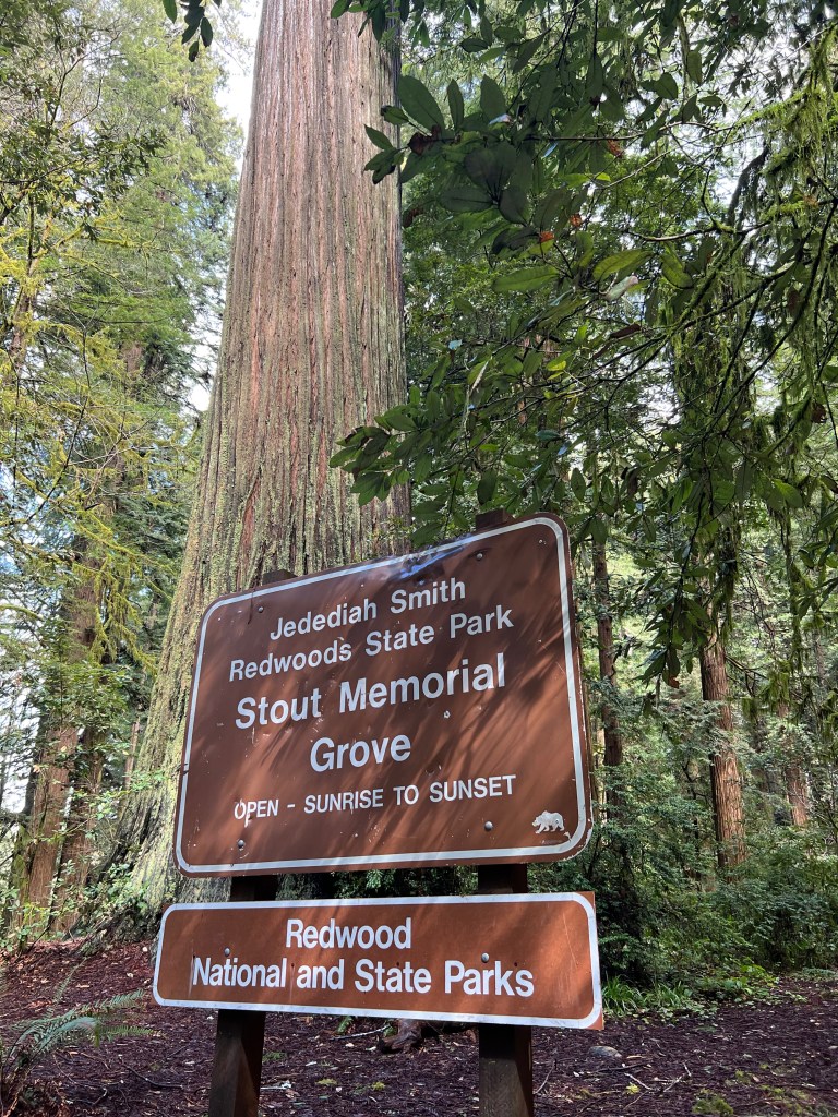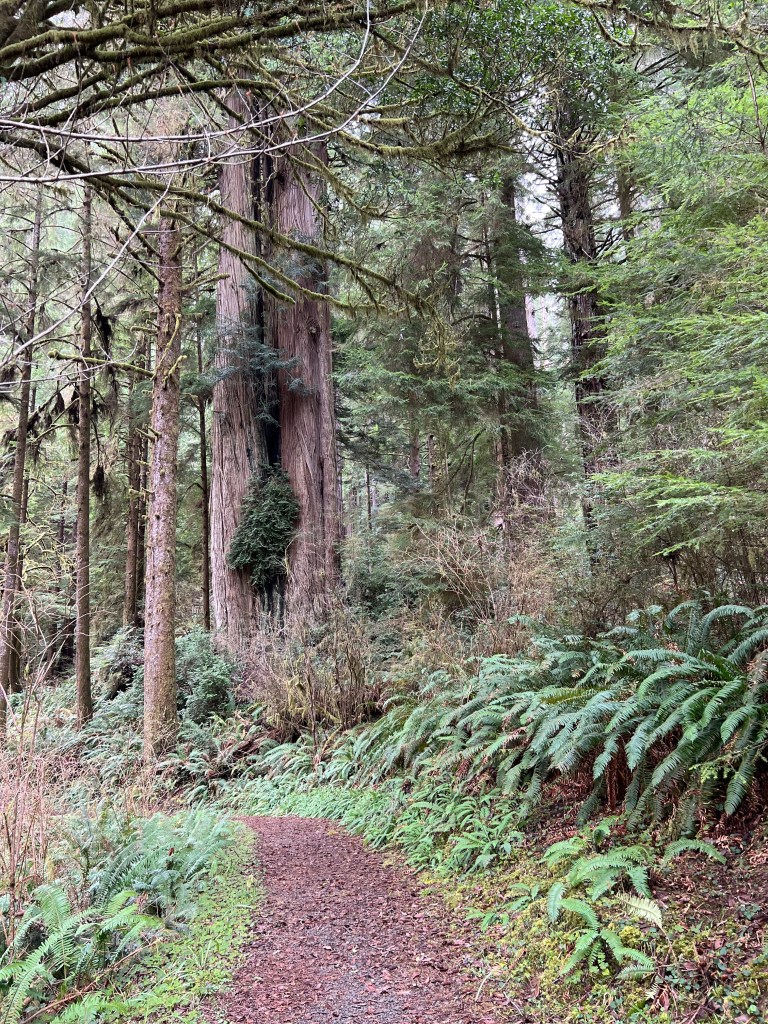 After Prairie Creek, I moved on to Crescent City and visited Jedediah Smith State Park. It was my last stop in California. I would love to have stayed in the park campground, but the sites were all too small for my Airstream. I parked in a nearby commercial campground. Smith was a white explorer and part of the gold rush. He was an original white settler in the area and the park is dedicated to his exploits. The Smith River runs through the park and out to the ocean, north of the park. Fishing and boating are favorite pastimes of the locals and tourists. There’s a 16-mile, hard-packed, dirt road that goes through the park. I drove part of it and stopped at Stout Grove and walked the trail. Being in the presence of these ancients makes it easy to understand why this is a World Heritage site.
