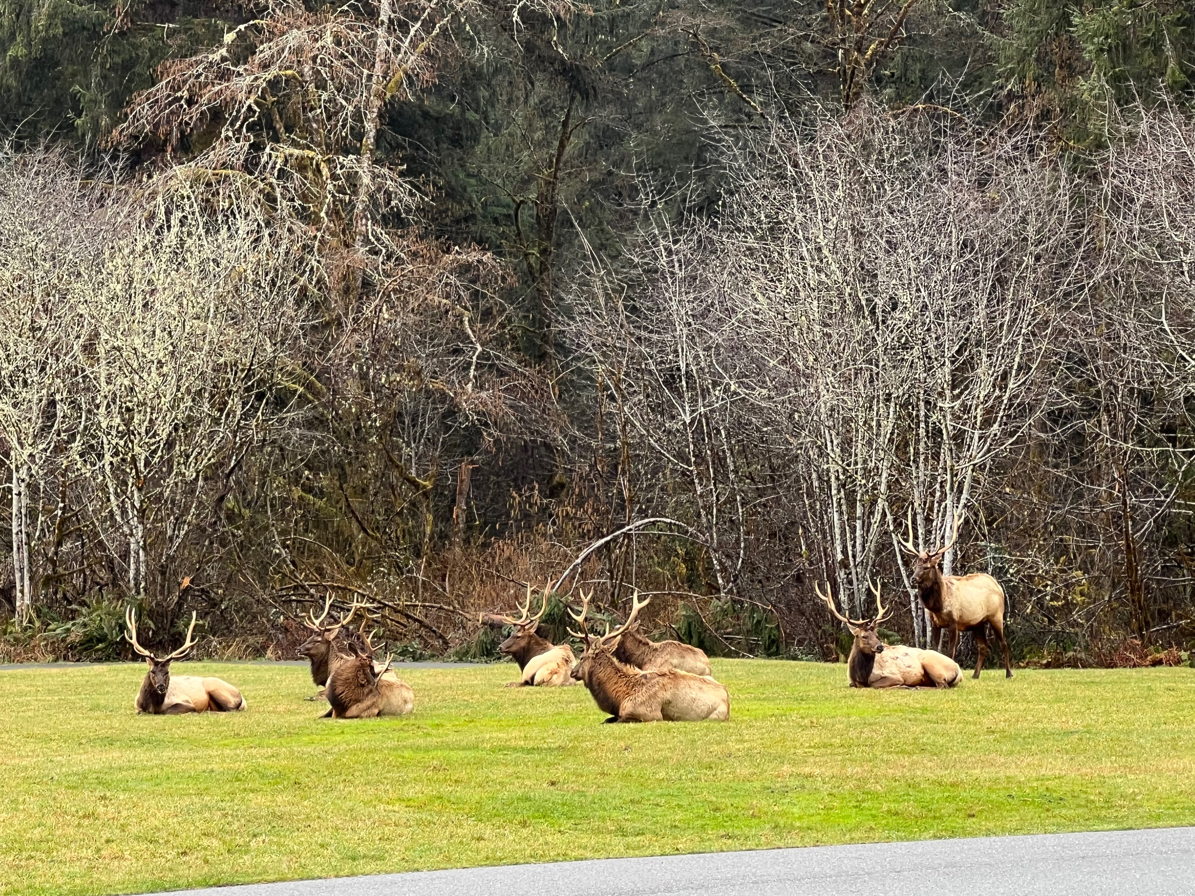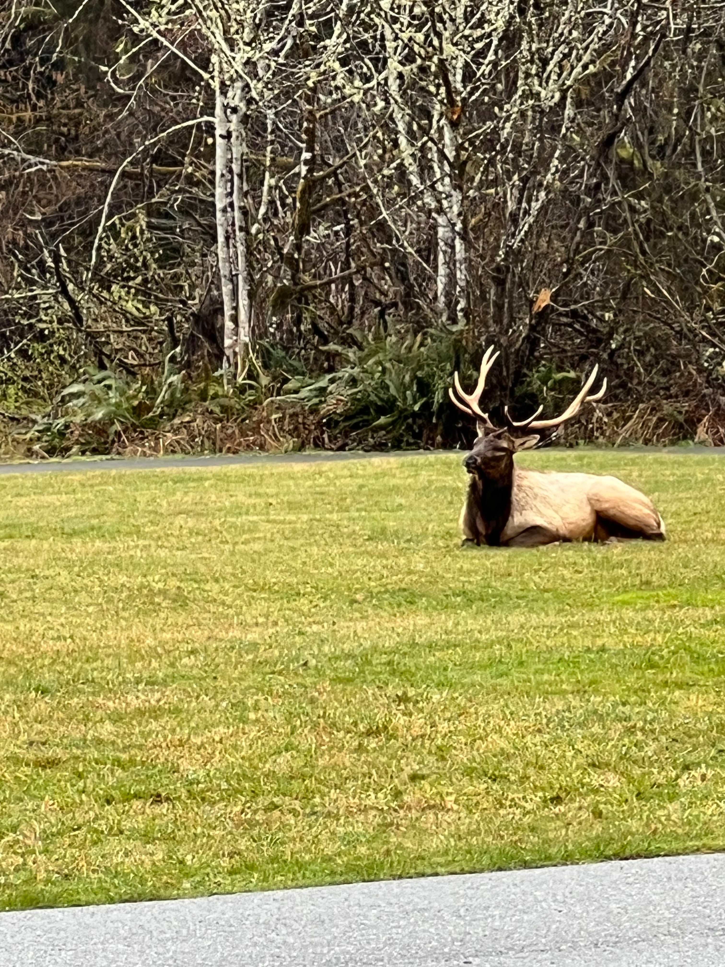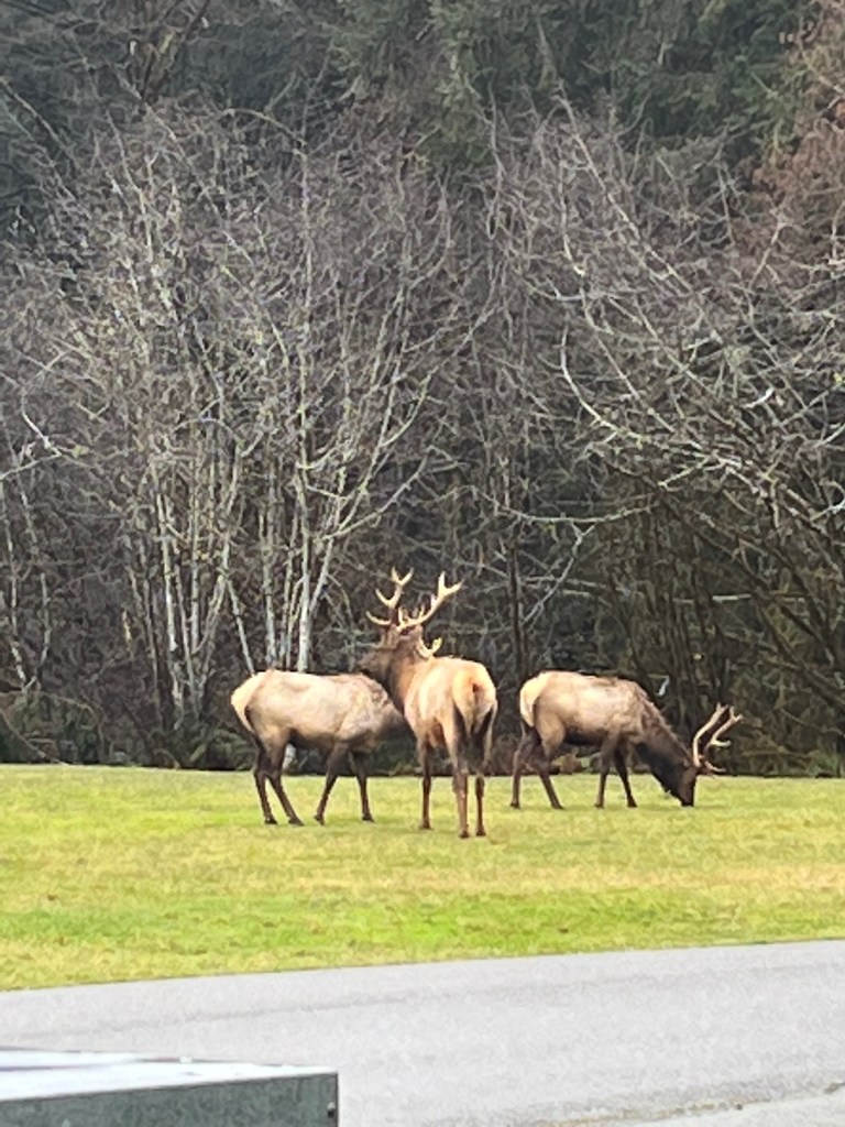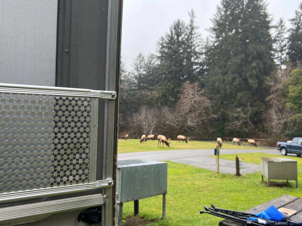 This campground was another bucket list item for me. Seeing wildlife is always a joy. This park is filled with roaming Roosevelt Elk who come through the campground, feed in the nearby meadows and grassy areas, and hang out. While the main meadow was in its winter hibernation, plenty of grassy areas were within the campground and around the visitor center. I saw elk every day in various places, but not near my campsite, which was in a grassy clearing next to the meadow. On my day of departure, I was busy getting ready to leave. I had gathered my bag of trash and was going to drop it into the container a few sites away from me. I opened my door and I felt like Dorothy. I wasn’t in Kansas anymore. There were the elk – eight males, right outside my door. They were having a hearty breakfast. When they had their fill, they all got down on the ground to hang out and chill. I was in awe. Sadly I had to hitch up and leave. All the while they sat contentedly until one got up and started pushing another elk to get that spot. It wasn’t fighting, merely asserting position. The camp host said that females are off having their calves and these are considered bachelor herds. I pulled out onto the camp road that looped around this grassy spot and I waved goodbye.