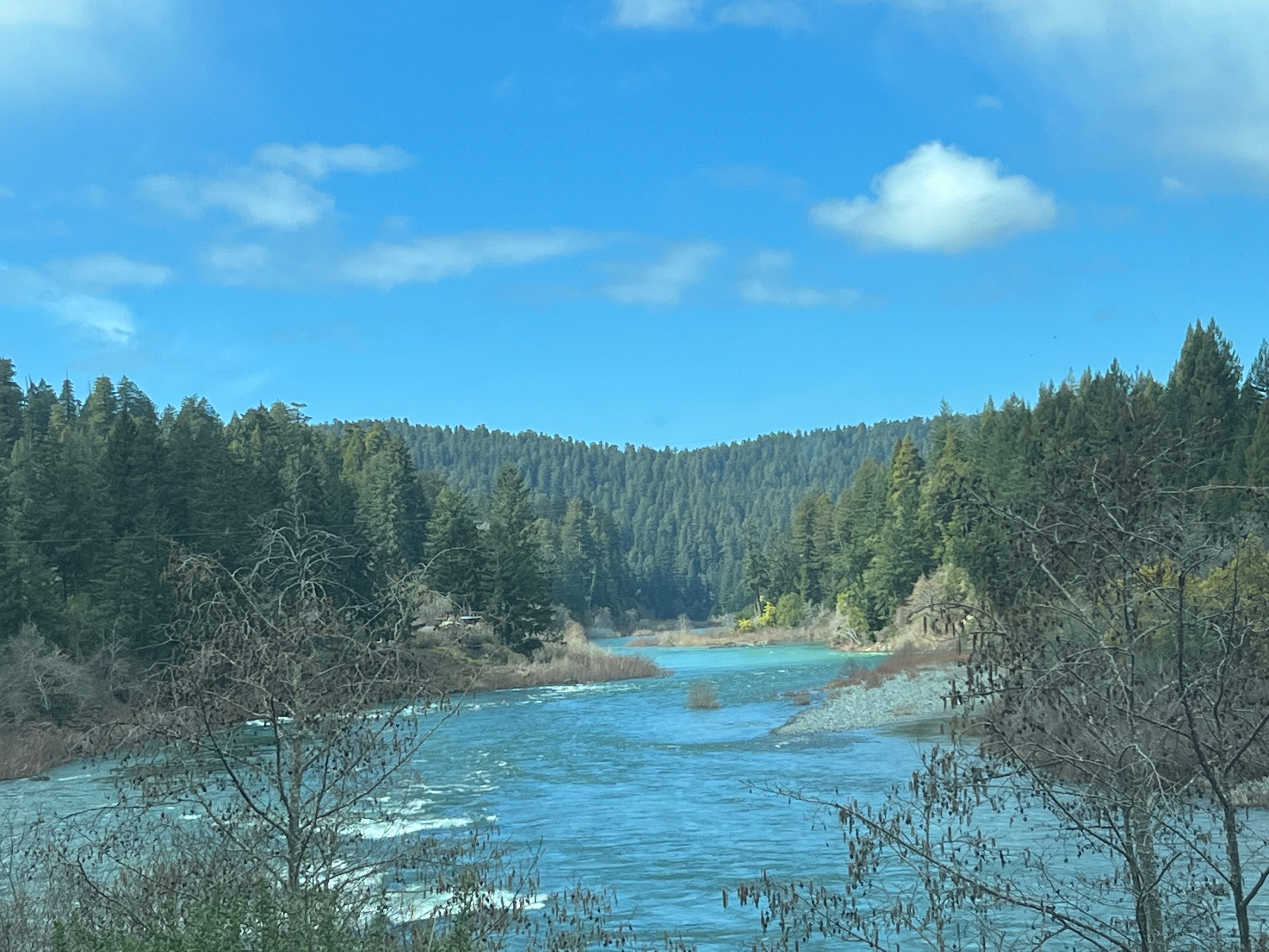 From just north of the San Francisco bay to Ukiah is the famed California wine country. Santa Rosa is a good base location and there are a dozen wineries to visit near the highway. Go farther northeast and you’ll be in Napa, an entirely different level of vineyard access. The 101 highway rolls through gentle hills covered in vines. The coastal mountains ring the area. I was amazed, even though it was still winter, how beautiful this area is. I can only imagine how magnificent the hills and valleys are when the vines are in bloom with abundant fruit. I had one sunny day in this area and sadly, gray skies did not make for photos worth taking. Ukiah is a small town with a main street full of historic buildings. The rest was the usual retail you’d find in any town. Lake Mendocino is the highlight of the area, but the National Forest lands and trails were closed for the winter. I would like to have gone up into the hills where the Russian River (of the wine fame) begins. There is a Buddhist monastery there. Weather and road conditions kept me from going.