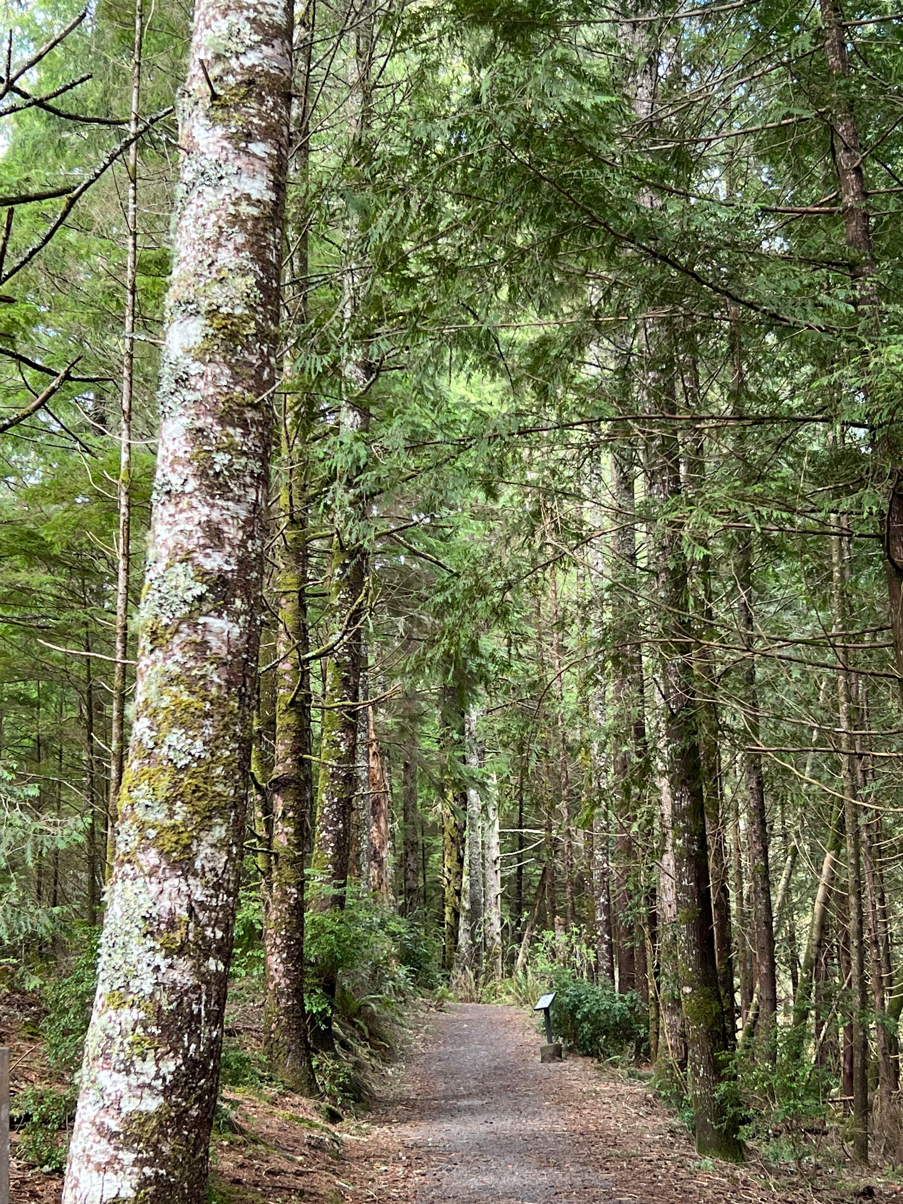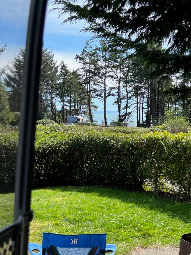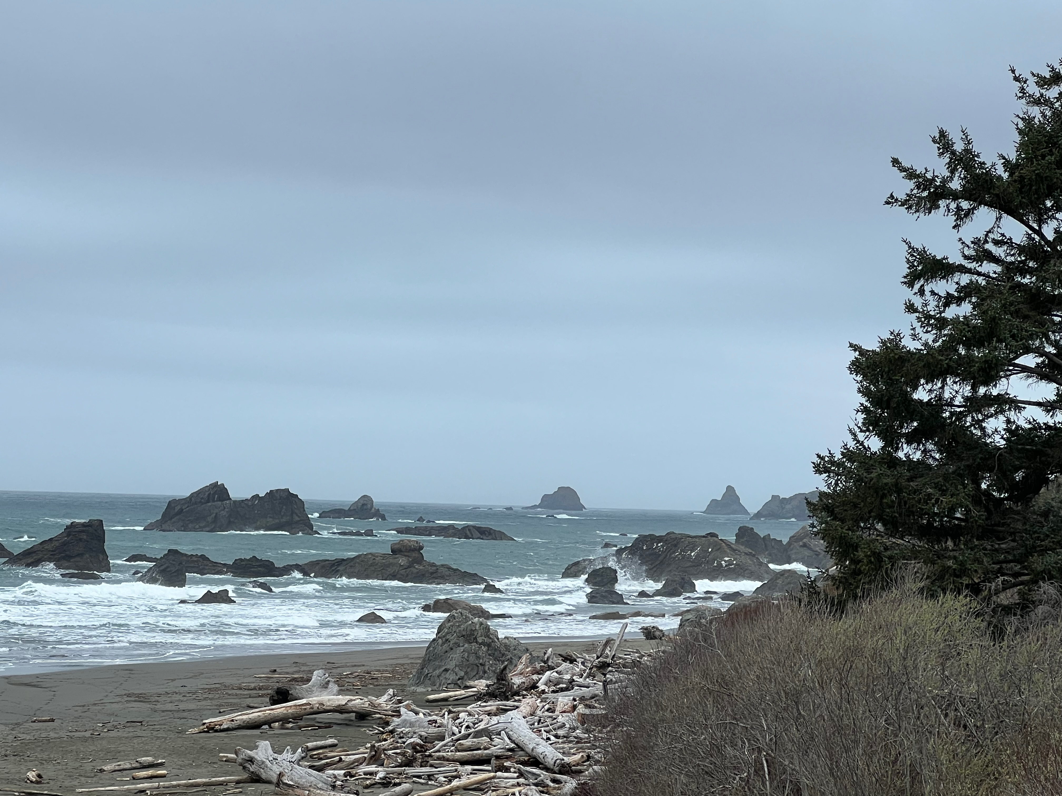 My next stop was a traditional standard, non-electric camping experience at Tillicum Campground managed by the US Forest Service. The park is on the beach and I could hear the ocean at my site on the non-ocean-front loop. Plenty of trees in the campground made it a lovely experience. Sadly, the concrete steps down to the beach ended at a pile of rocks (both staircases). Because of the rain, the rocks were wet and slippery. You have to climb over these rocks to get to the beach and I am not steady enough for that. I might have been able to use my hiking poles to anchor my position, but I had read a review online from a woman who had slipped, fell, and badly twisted her ankle. I opted to sit at the picnic tables in empty campsites and marvel at the beach. There was less rain at this stop than in previous days.