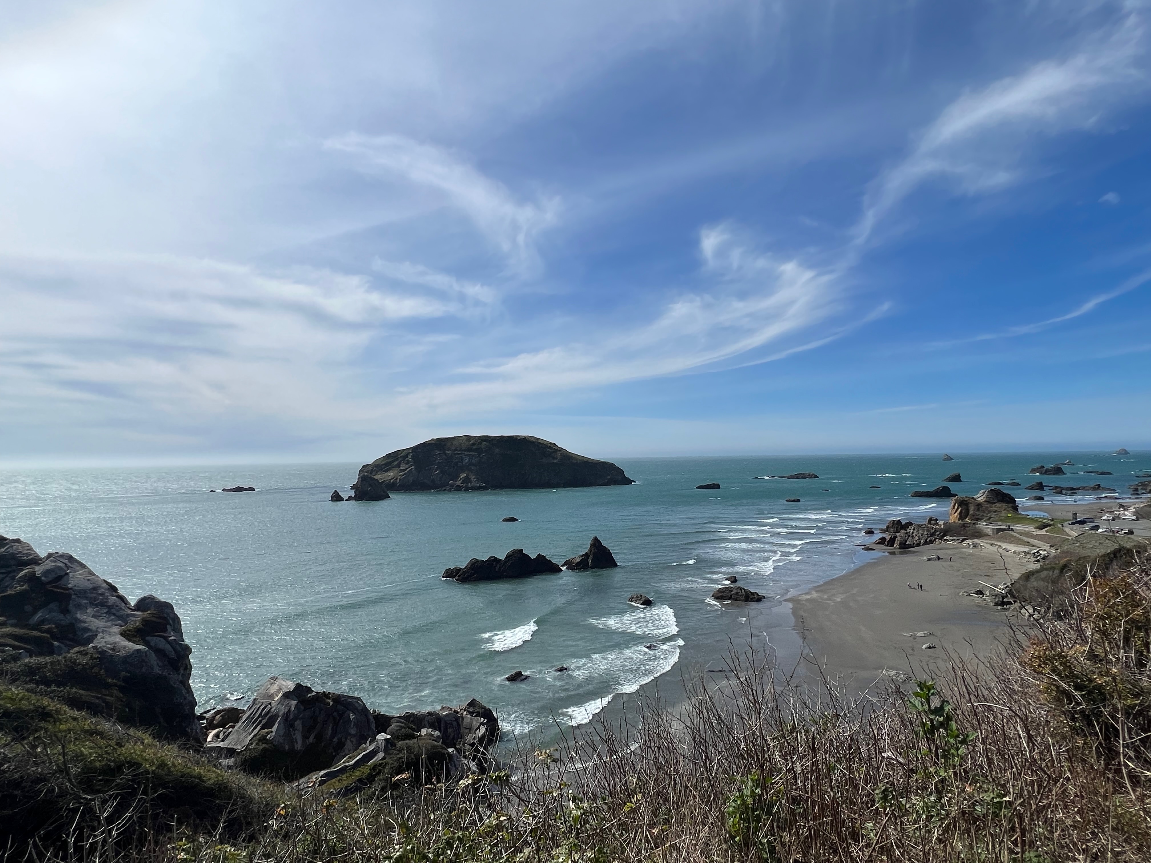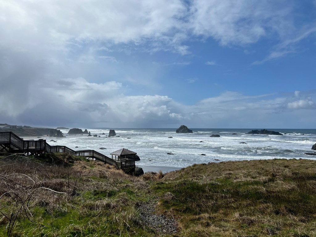Harris Beach State Park was my first stop in Oregon. It was my first opportunity to see the coastal “islands” or rock outcroppings that Oregon is famous for. I enjoyed a sometimes sunny afternoon and warmer temperatures that gave me what turned out to be false hope, that better days were ahead. The full-service town of Brookings is a couple of miles south and very convenient. The access to the beach from the park is down different sets of stairs – either from the campground or down a hill in the day-use area (where you can drive and park). I elected not to do the stairs routine but enjoyed the fresh sea air, warm sunshine, and the views which were gorgeous. My second day turned dark, cloudy, and rainy but I used it to get services in Brookings and enjoy the view of the ocean from my campsite.