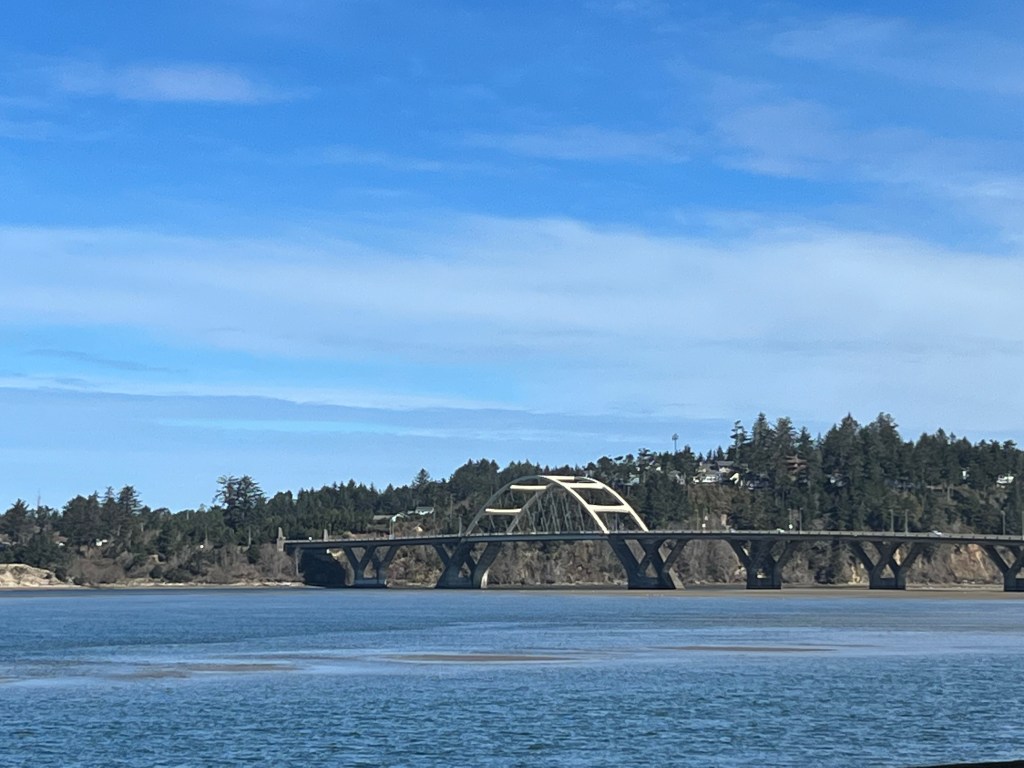 I opted for a refueling overnight stay at McKinley’s Marina and RV Park in Waldport. It was a mere 20 minutes north of Tillicum. When I do a slow roll, I do it s-l-o-w. I needed electricity for my batteries, propane for my furnace, and laundry for my clothes. This place delivered all three on-site in a serviceable park on the Alsea River that dumps into the ocean a mile away. This is a very popular crabbing area that fills up during the season. One of the sights to see is the amazing Alsea Bay Bridge. This is one of many Art Deco bridges on the 101 in Oregon. I usually didn’t have an opportunity to photograph them. They are all very different but each has flourishes at either end of the bridge in that distinctive art style.