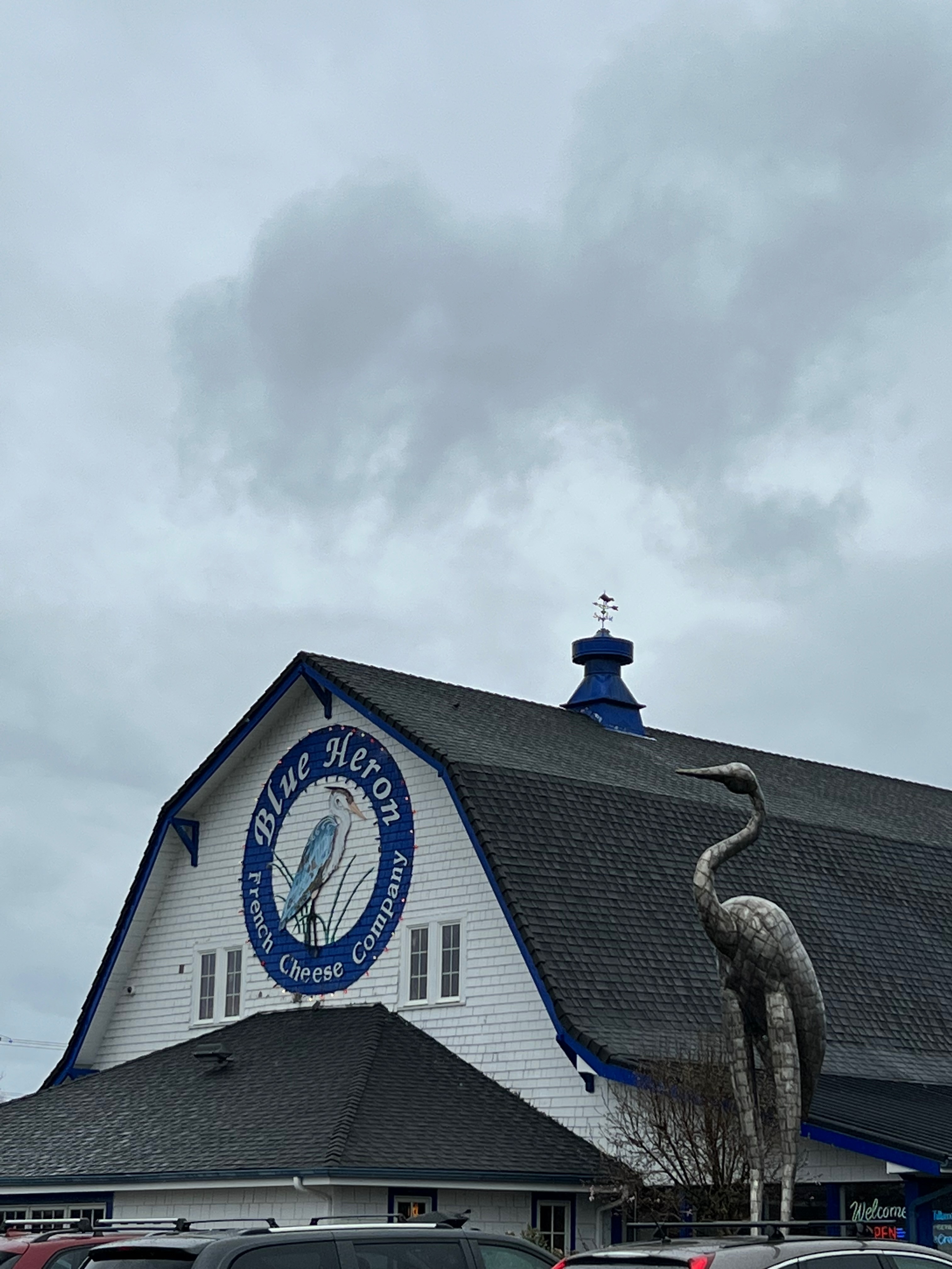 I arrived at the Blue Heron French Cheese Company in Tillamook. They let you park in their very level gravel parking lot for free. I grabbed some takeout for a late lunch and had breakfast in their fast-food dining room which was lovely. There’s a petting zoo, complete with crowing roosters, chickens, and goats on the property.