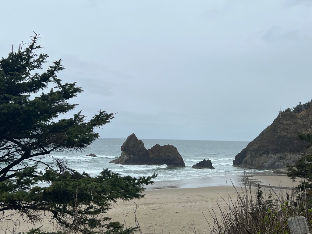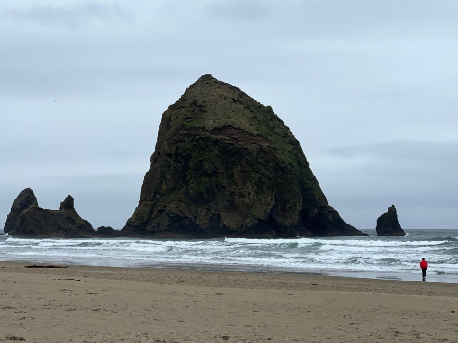 It rained the next day, but I drove south to Cannon Beach. It was fairly busy with all the spring break families. I wasn’t going to let the rain stop me from an obligatory pilgrimage to the Haystack. Although the lack of parking nearly kept me away. The beachfront is extremely wide and the Haystack is an imposing obelisk. It seems otherworldly to see this huge rock formation just sitting near the shoreline. I managed to get a few photos as the wind, sand, and rain pelted me. It wasn’t that bad, but it was tedious. I had been living in nearly daily rain since the first of the year. I’m used to the misty rain in Seattle. This was rain-rain with intermittent sleet. Manzanitas and Cannon Beach are small beach towns with limited services and goods but plenty of little restaurants and bars for seaside fun. I’m sure these places are hopping in the summer.