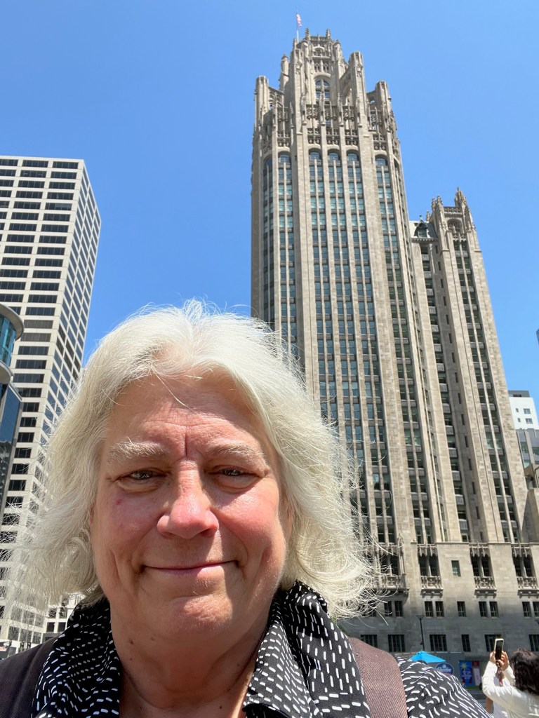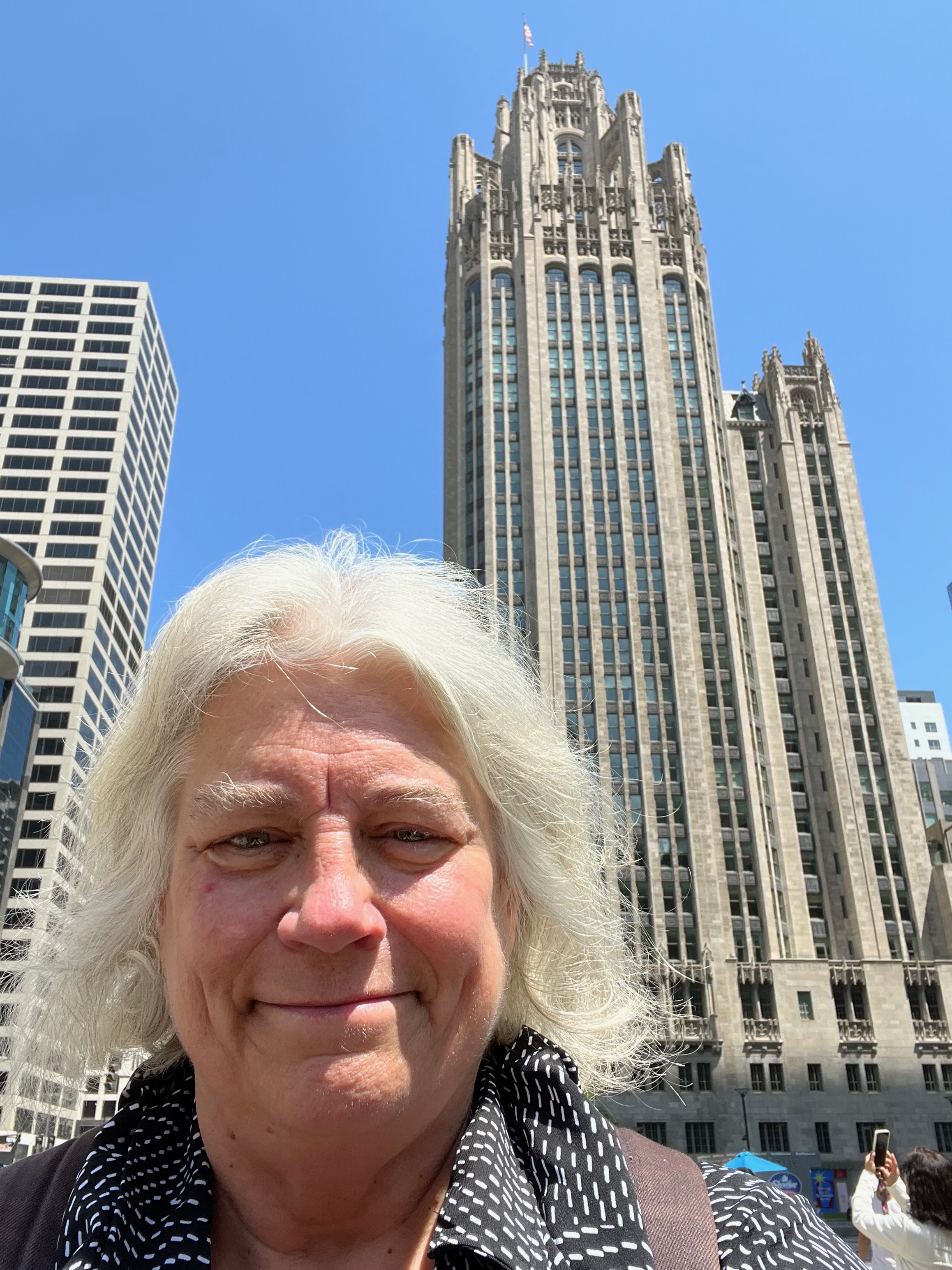 I decided to change the title and theme of this site in keeping with a new adventure. I won’t be driving and camping around the country. I’ll be walking and riding mass transit around Chicago. I taught urban studies, politics, and planning for over 30 years as a university professor. I’ve been to every major city in the US and most in Canada. Chicago has always remained my favorite place. I return to where it all started and hope to see the city newly. I’ve never really left, though. I’ve been back to visit nearly every year since I left when I was 14. I love this place that much. If you came to follow my Airstream exploits, I hope you’ll stay to see a new kind of adventure in the city. I have a laundry list of places to explore and enjoy. Here is a not-so-flattering photo of me looking for real estate on Michigan Avenue in front of the iconic Tribune Tower (which ironically has been turned into luxury condos).