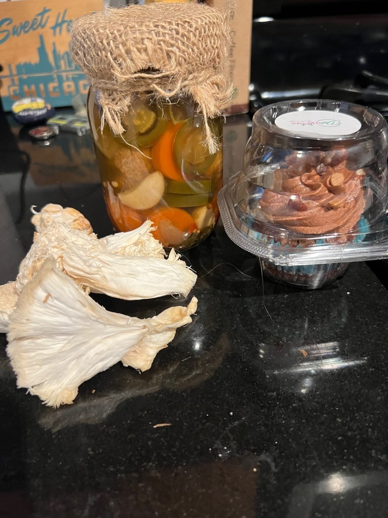 I got a vegan turtle/pecan cupcake (delicious) from DaVegiNista.com, lions mane mushrooms (they are meaty and fibrous and supposed to be a good “brain” food), and a local favorite – pickled carrots, cauliflower, and jalapeno. This is a homemade giardiniera – a Chicago staple. Though this market may be small, it had some solid contenders. I got there before 10 thinking I might be too late. Vendors were still setting up. Sunday morning is a slow start for many folks or they start later to catch the after church crowd. Next week I may come a little later to see what else is available.