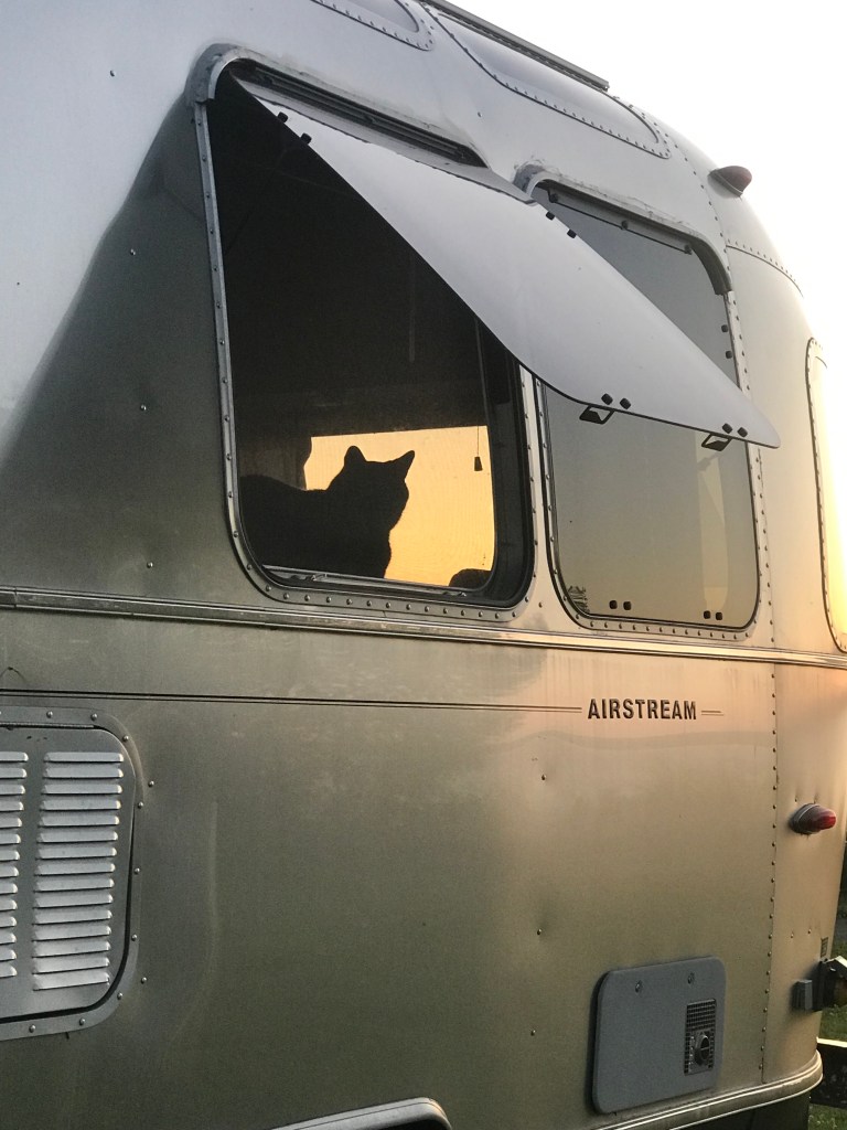 Inky traveled for five years in the Airstream and was as intrepid as I was. She prowled the truck as we bumped down the road. She luxuriated in the Airstream and loved to watch the birds and squirrels. Now she’s back in a large space with no travel. She’s not quite used to it yet. She’s spent a lot of time curled up behind a door in the only room with carpet. I thought I was going to get rid of carpet, but she enjoys it so much, I may have to keep it 🙂 She has lots of windows with wide window sills – perfect for cat sitting. Once she gets used to the space and noises she’ll be back to her old self. Right now she is pestering me to be fed. Duty calls…